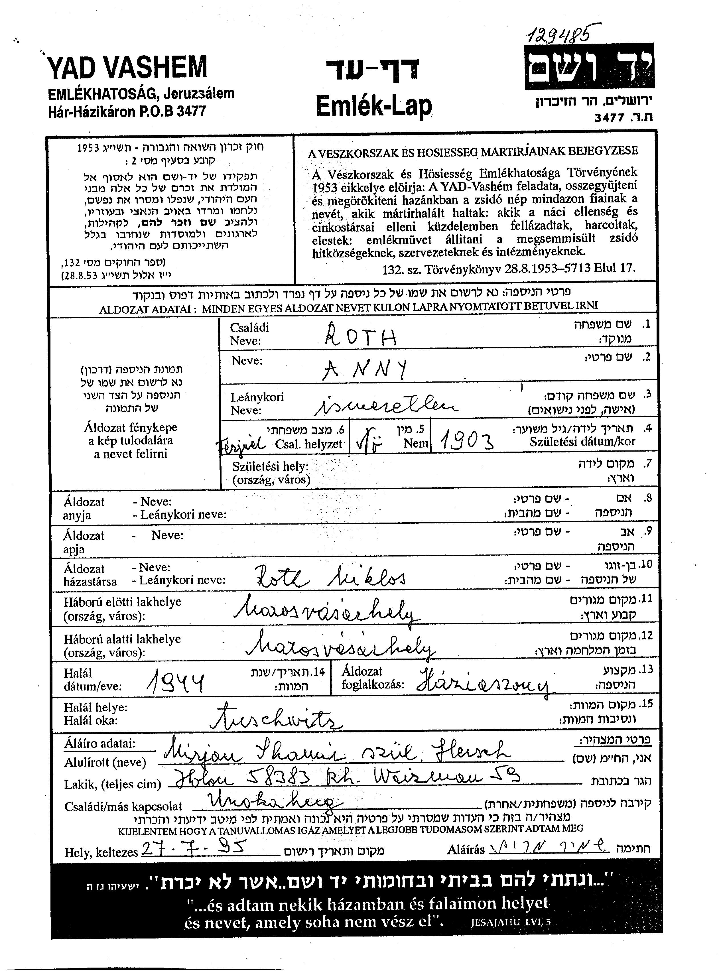 Roth Rut Anny 1903 Marosvasarhely, Roumanie Feuille de témoignage