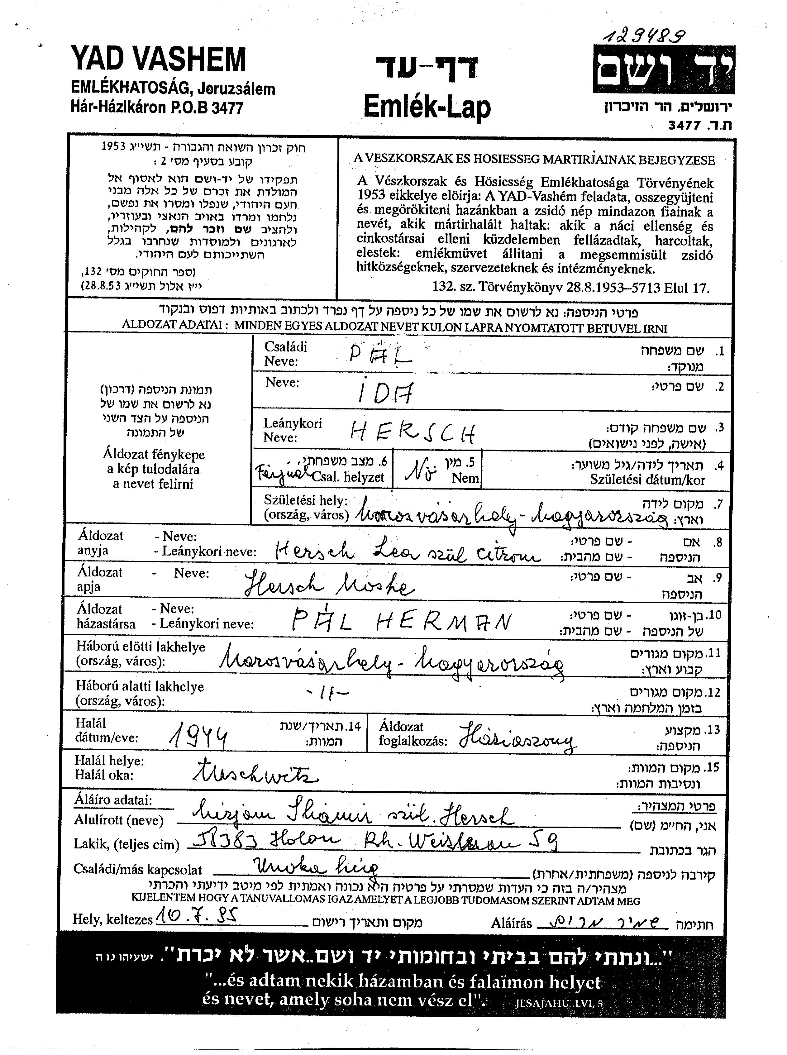 Ida Pal née Hersch est née à Marosvasarhely, Roumanie, fille de Moshe et de Lea née Citrom. Elle était Femme au foyer et Mariée à Herman. Avant la seconde guerre mondiale elle vivait à Marosvasarhely, Roumanie. Pendant la guerre, elle était à Marosvasarhely, Roumanie.