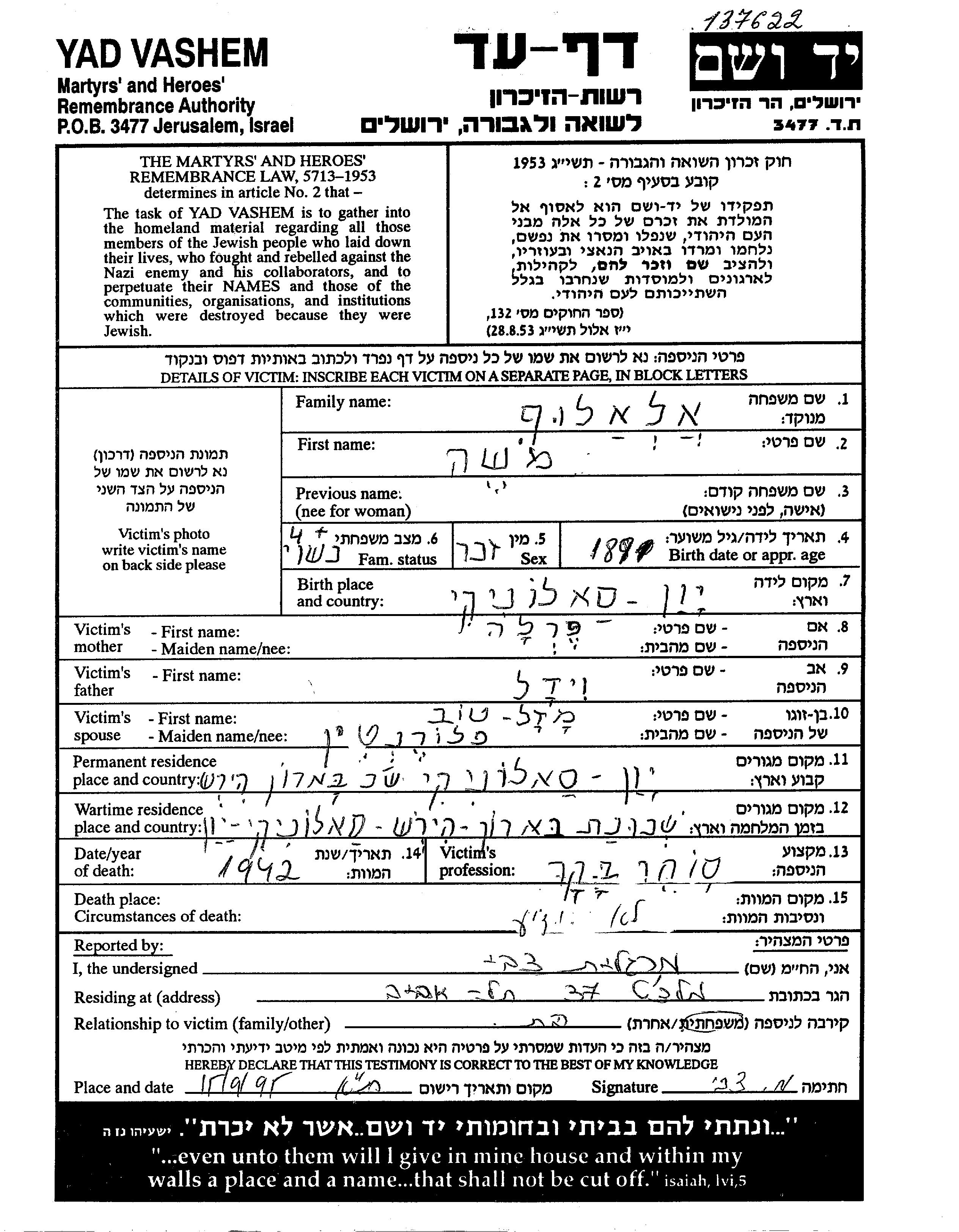 Moshe Alaluf est né à Saloniki, Grèce en 1891, fils de Vidal et de Perla. Il était Négociant en bétail et Mariée à Mazal Tov. Avant la seconde guerre mondiale il vivait à Saloniki, Grèce. Au cours de la guerre, il était à Saloniki, Grèce.