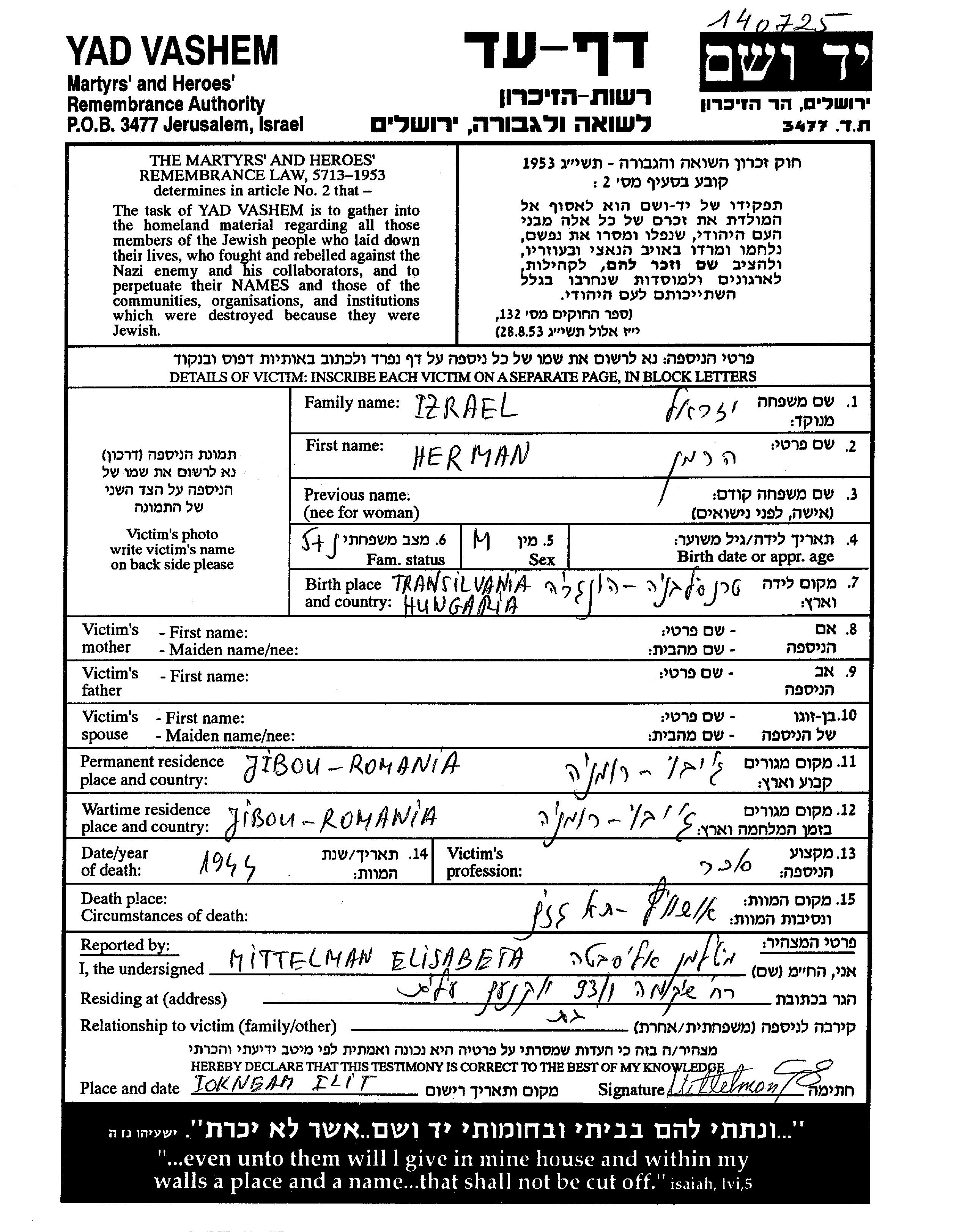 Izrael Herman Jibou, Roumanie Feuille de témoignage