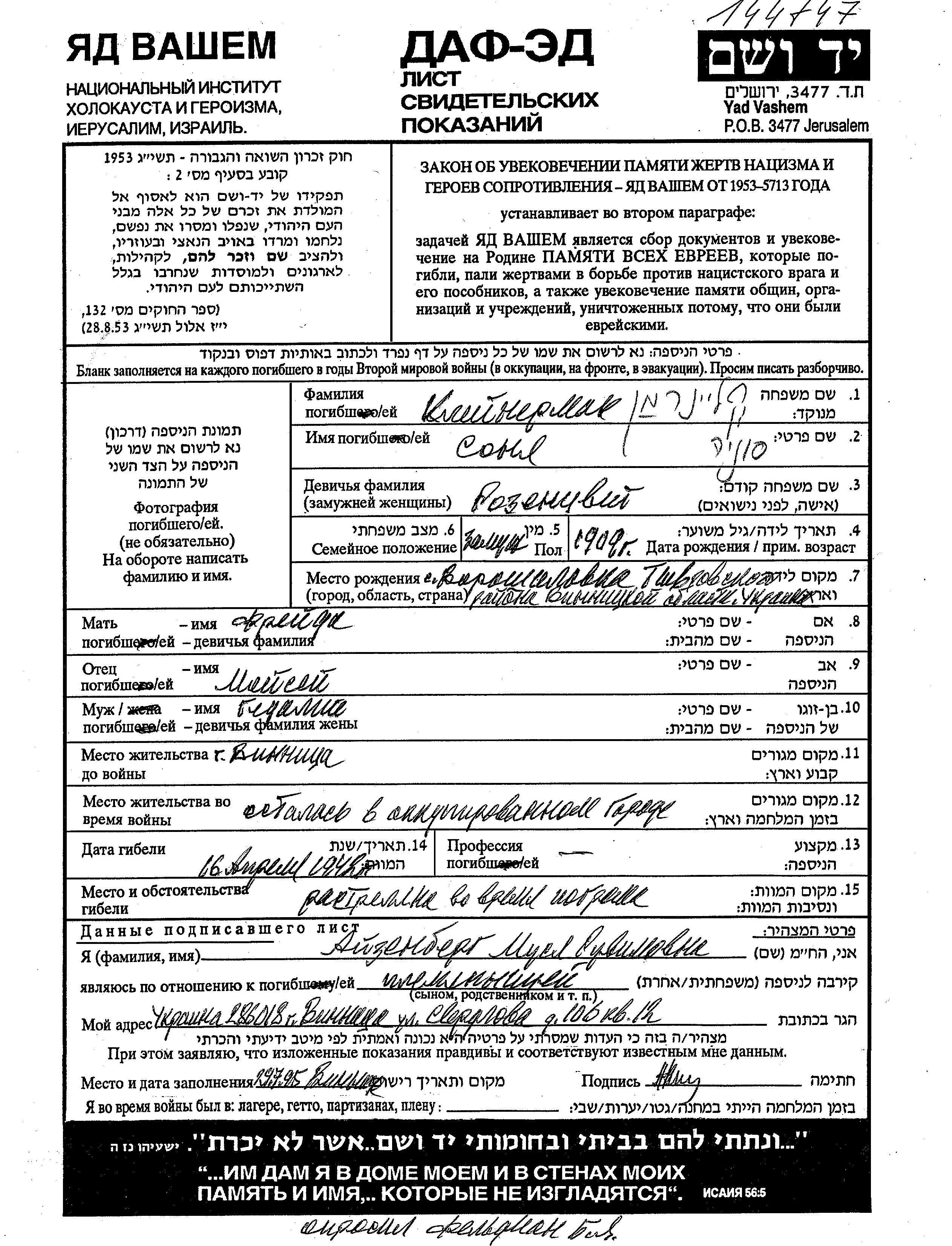 Kleinerman Sonia 1909 Vinnitsa, Ukraine (URSS) Feuille de témoignage