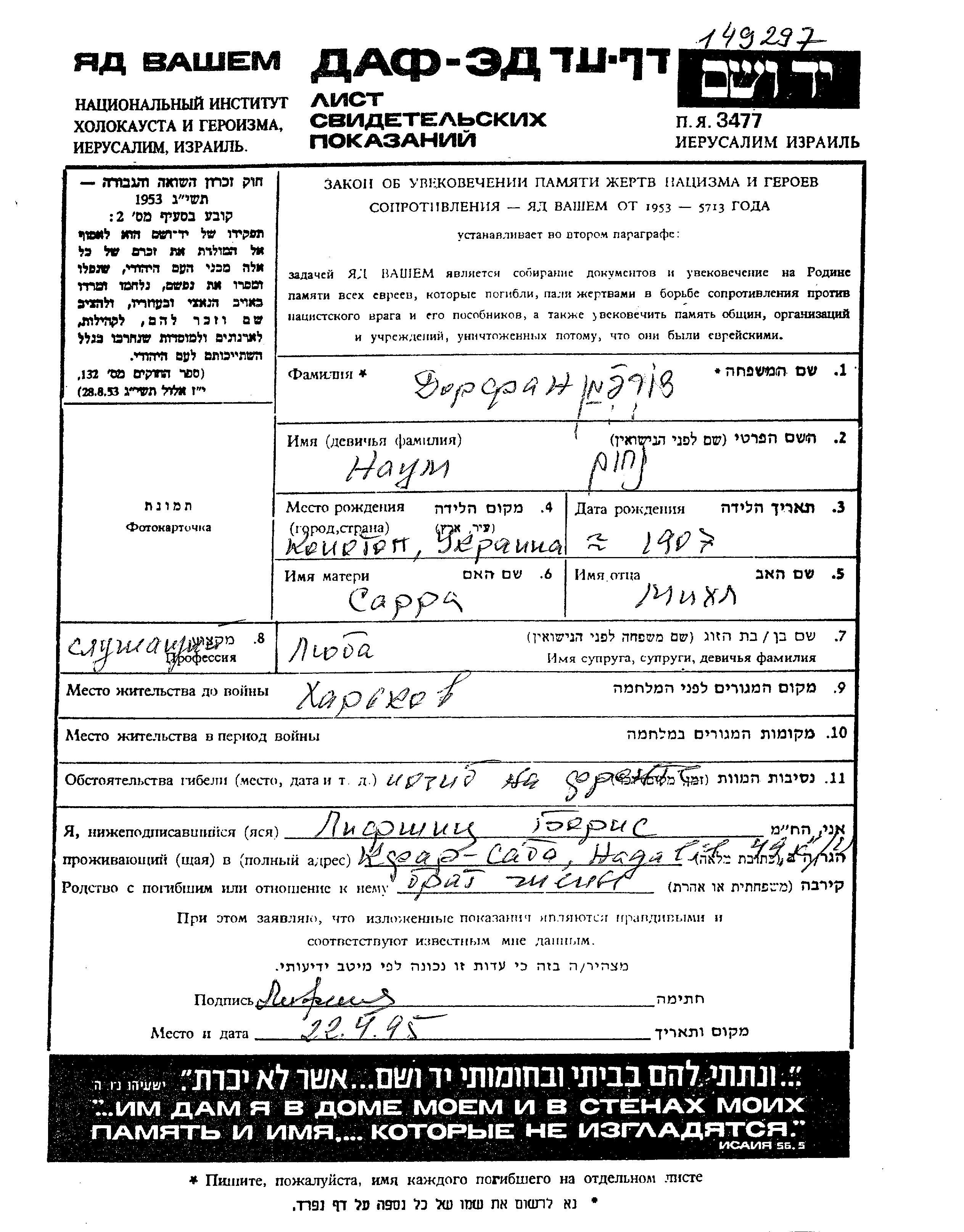Naum Dorfan est né à Konotop, Ukraine (URSS) en 1907, fils de Mikhl et de Sara. Il était Employé/e de bureau et Mariée à Liuba. Avant la seconde guerre mondiale il vivait à Kharkov, Ukraine (URSS). Au cours de la guerre, il était à the Soviet armed forces. Naum a été tué en tant que militaire pendant la Seconde Guerre mondiale.