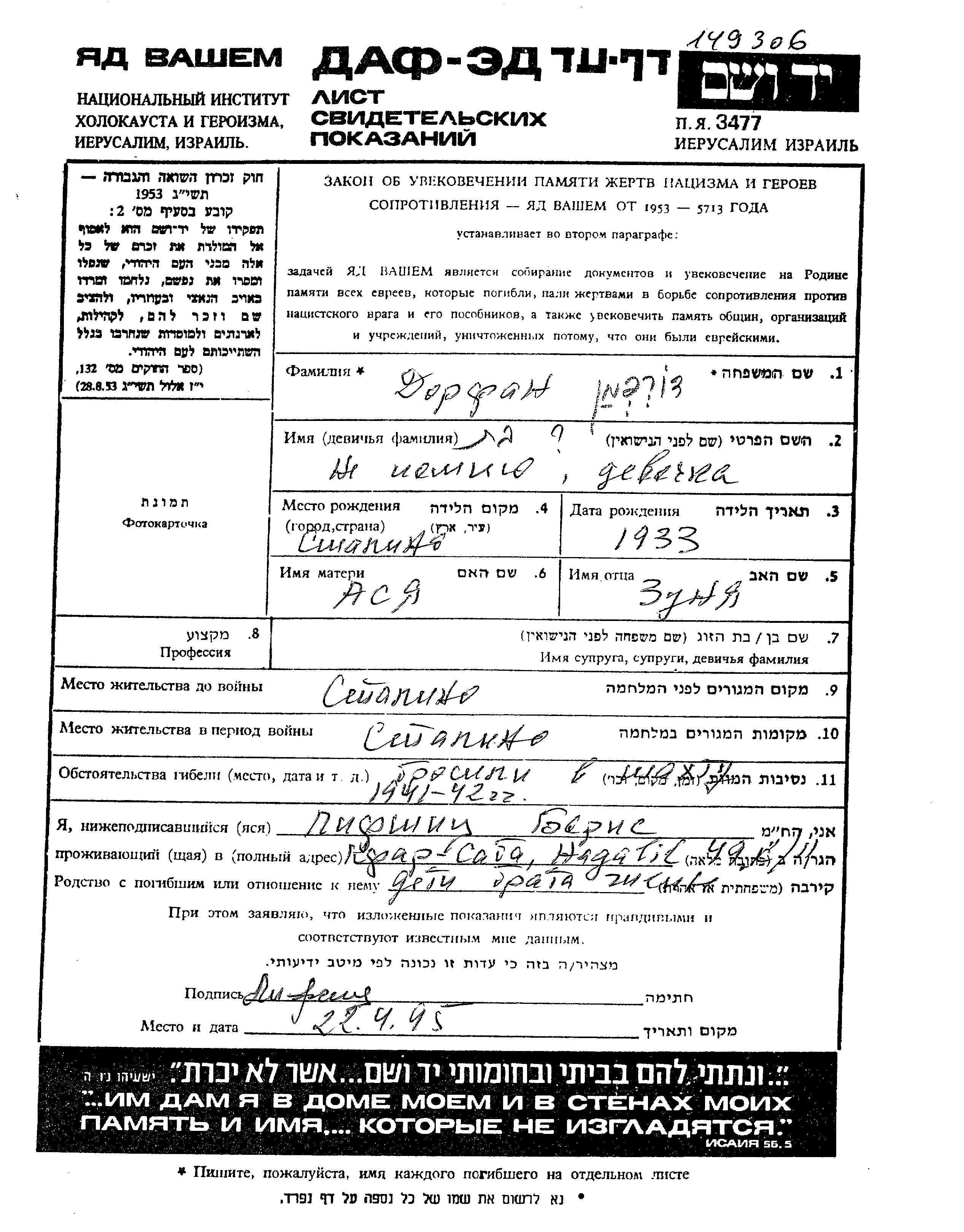 Dorfan prénom inconnu 1933 Stalino, Ukraine (URSS) Feuille de témoignage