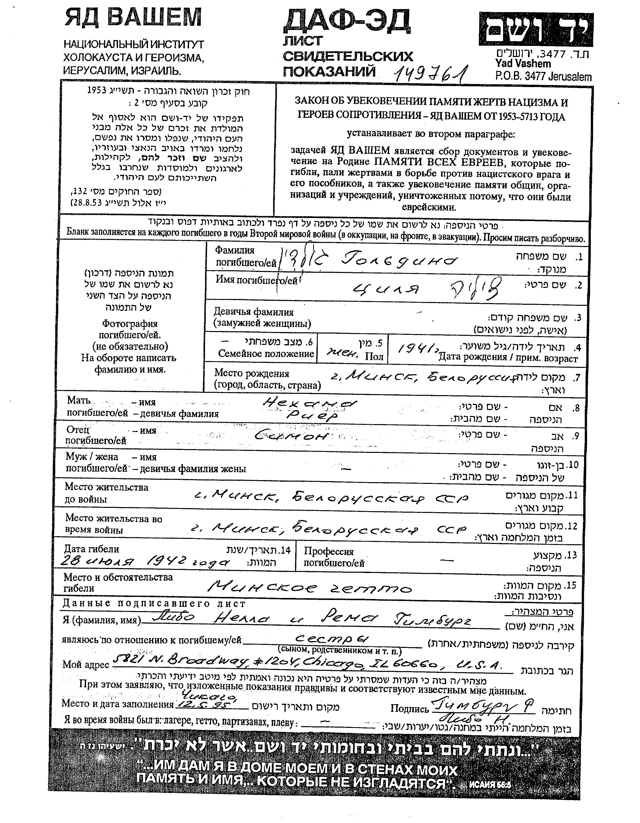 Goldin Tzilia 1941 Minsk, Bélorussie (URSS) Feuille de témoignage
