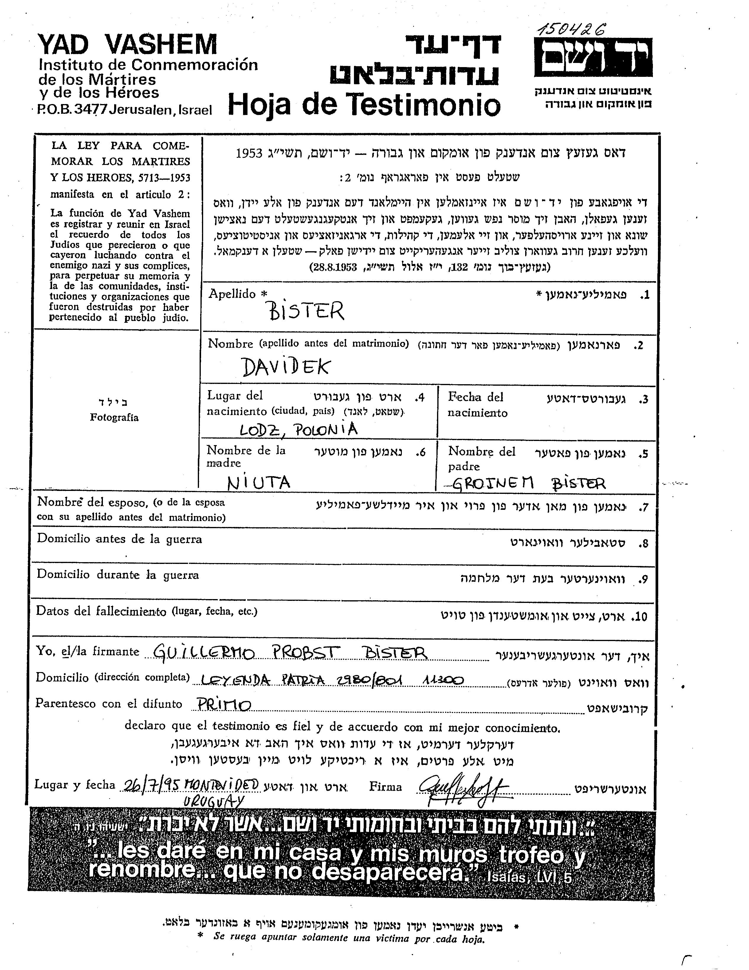 Bister Davidek endroit inconnu, Feuille de témoignage