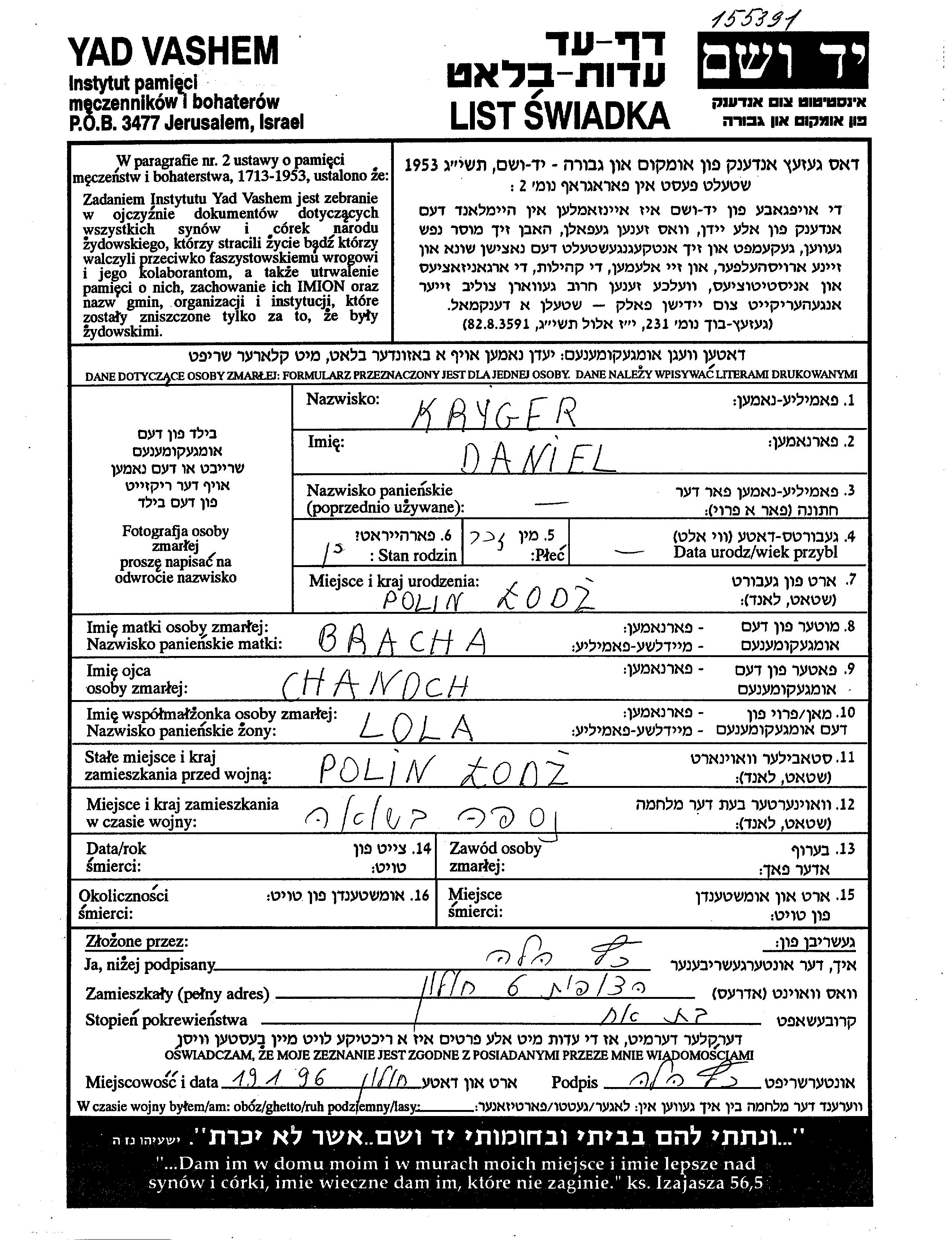 Kryger Daniel Lodz, Pologne Feuille de témoignage