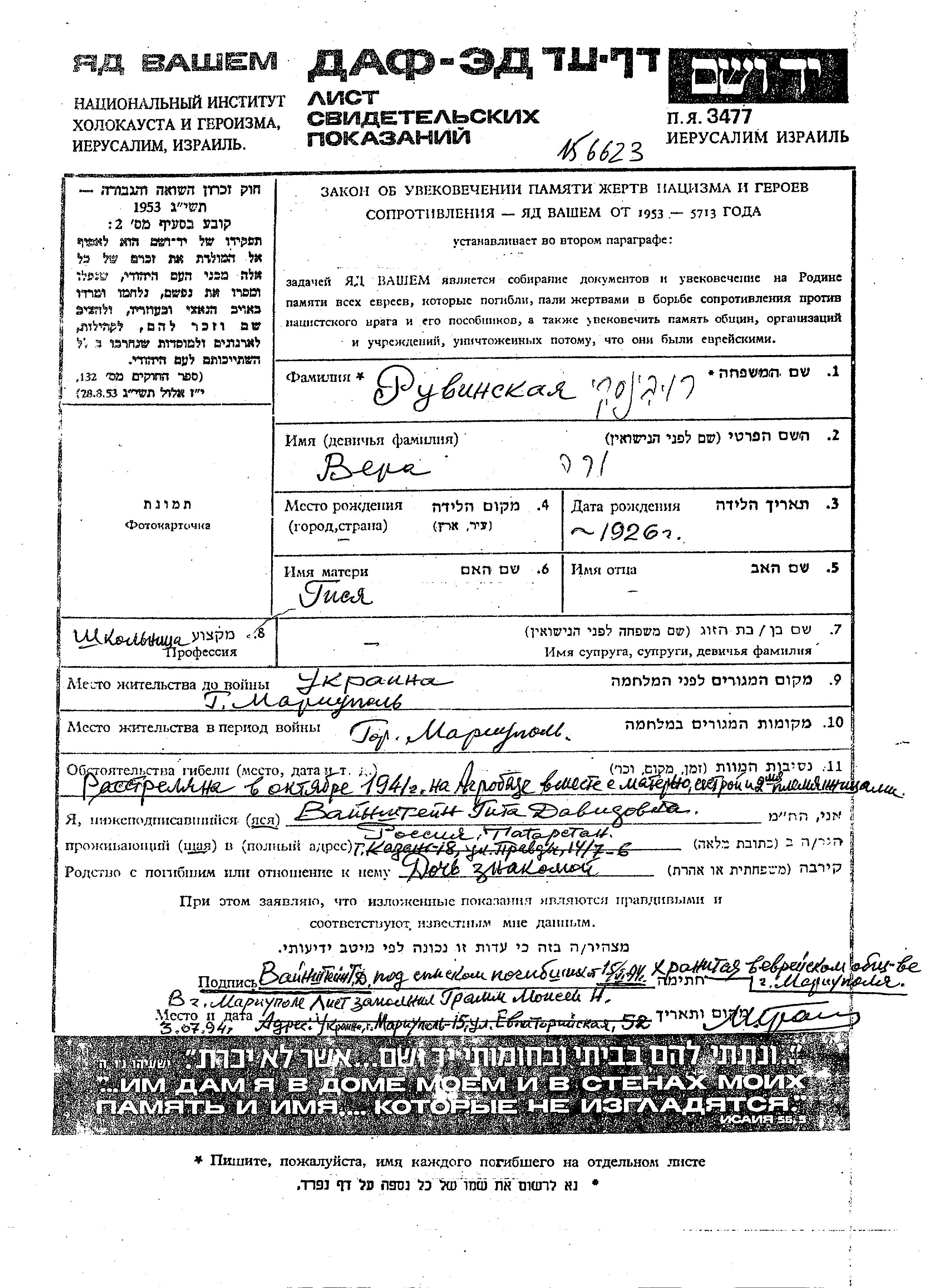 Ruvinski Vera 1926 Mariupol, Ukraine (URSS) Feuille de témoignage