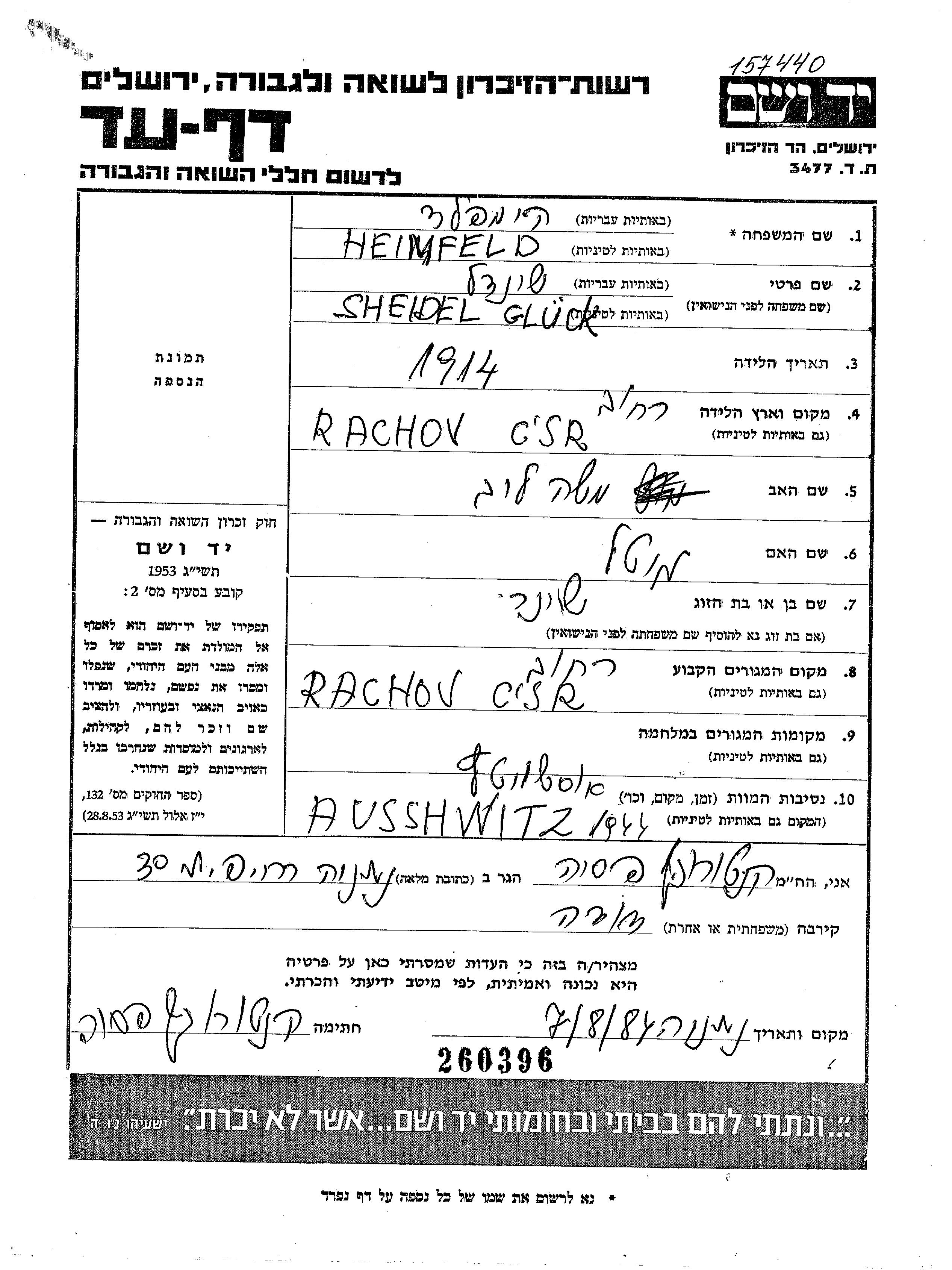 Sheidel Heimfeld née Glueck Geler est née à Rachov, Tchécoslovaquie en 1914, fille de Moshe Leib et de Gitel née Sheiner. Elle était Mariée à Leibi Leiba. Avant la seconde guerre mondiale elle vivait à Rachov, Tchécoslovaquie. Pendant la guerre, elle était à Tchécoslovaquie.