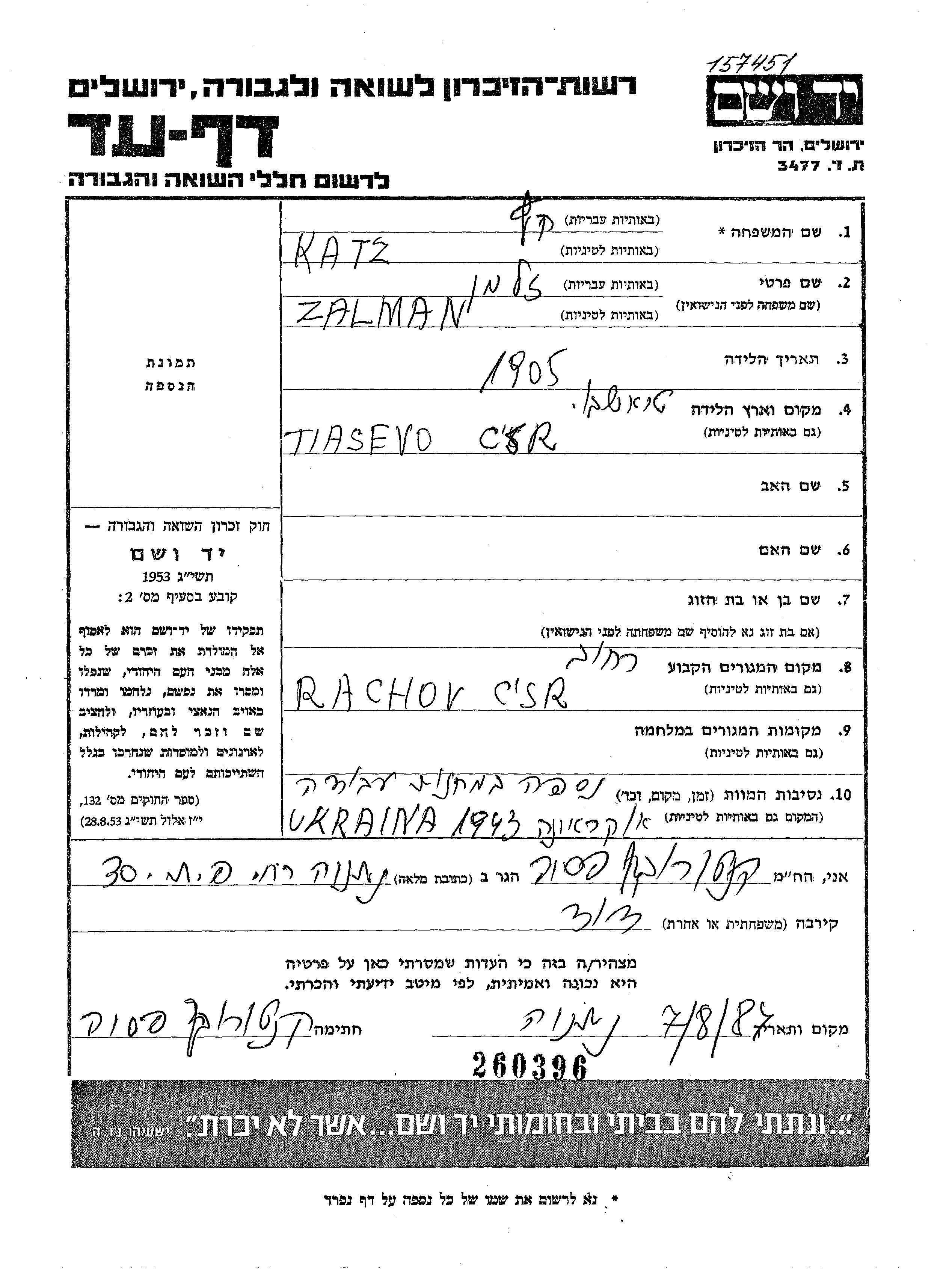 Katz Zalman 1905 Rachov, Tchécoslovaquie Feuille de témoignage