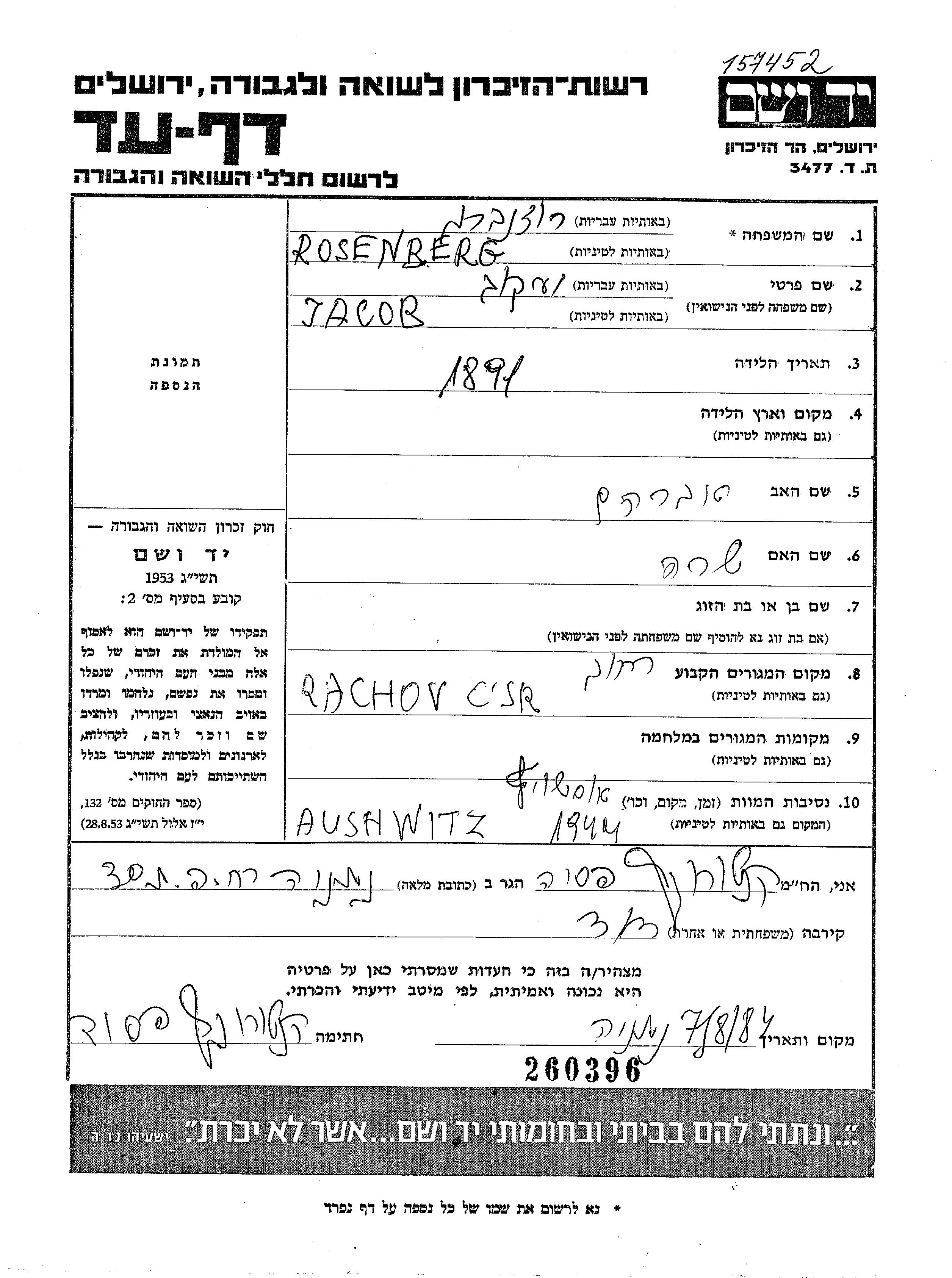 Rosenberg Jacob 1891 Rachov, Tchécoslovaquie Feuille de témoignage