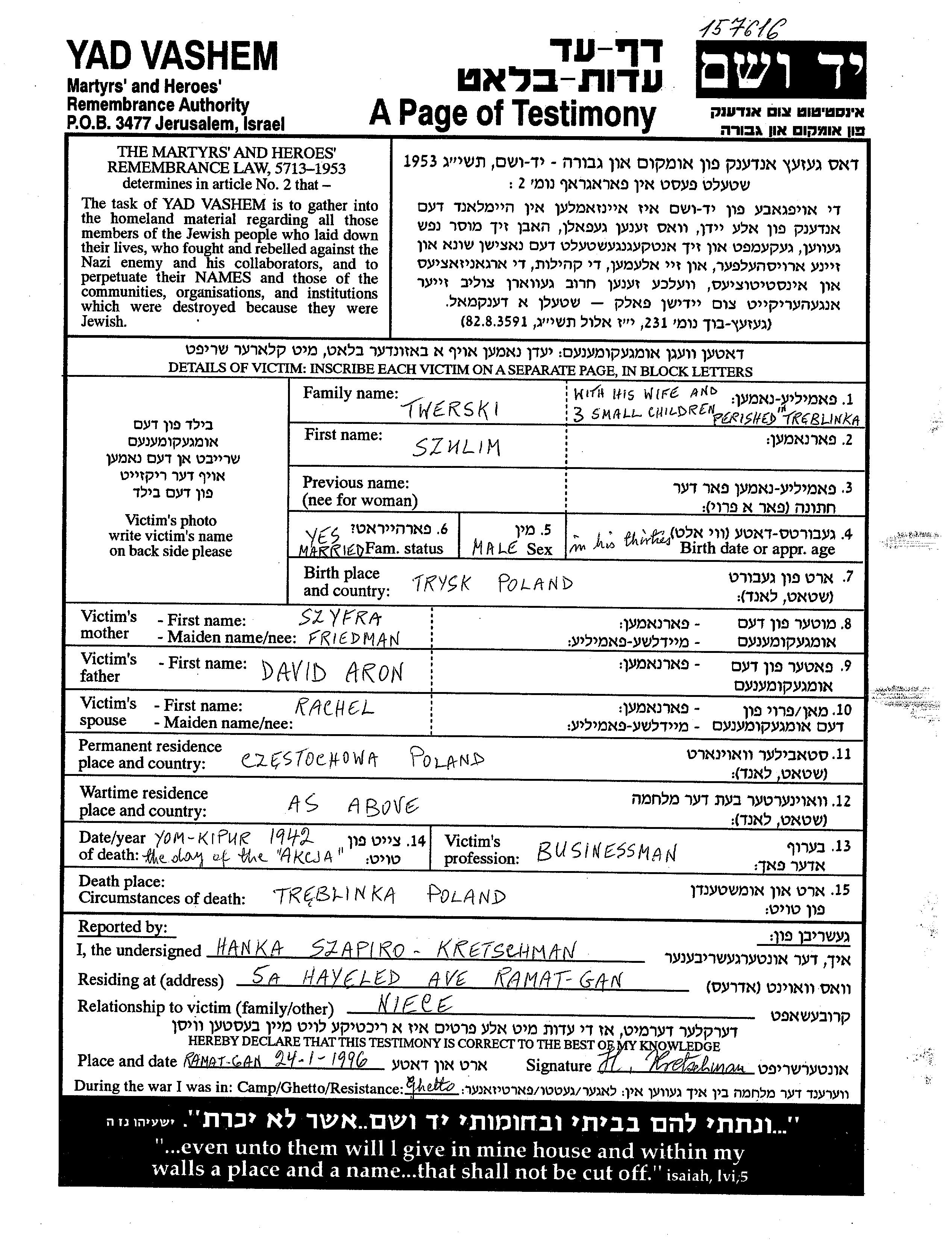 Szulim Twerski est né à Trisk, Pologne en 1912, fils de David Aron et de Szyfra née Friedman. Il était Homme d'affaire et Mariée à Rachel. Avant la seconde guerre mondiale il vivait à Czestochowa, Pologne. Au cours de la guerre, il était à Czestochowa, Pologne.