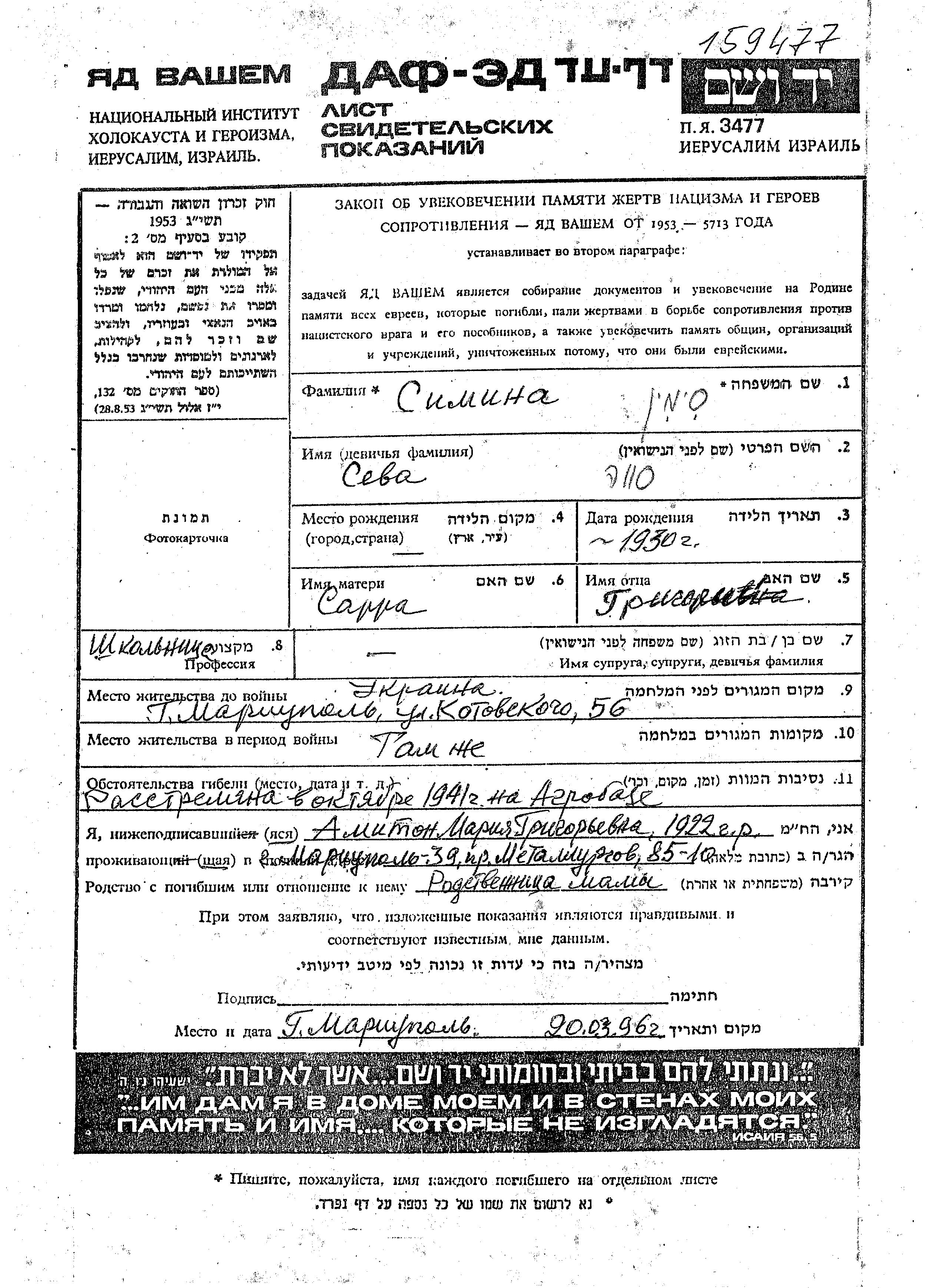 Simin Seva 1930 Mariupol, Ukraine (URSS) Feuille de témoignage