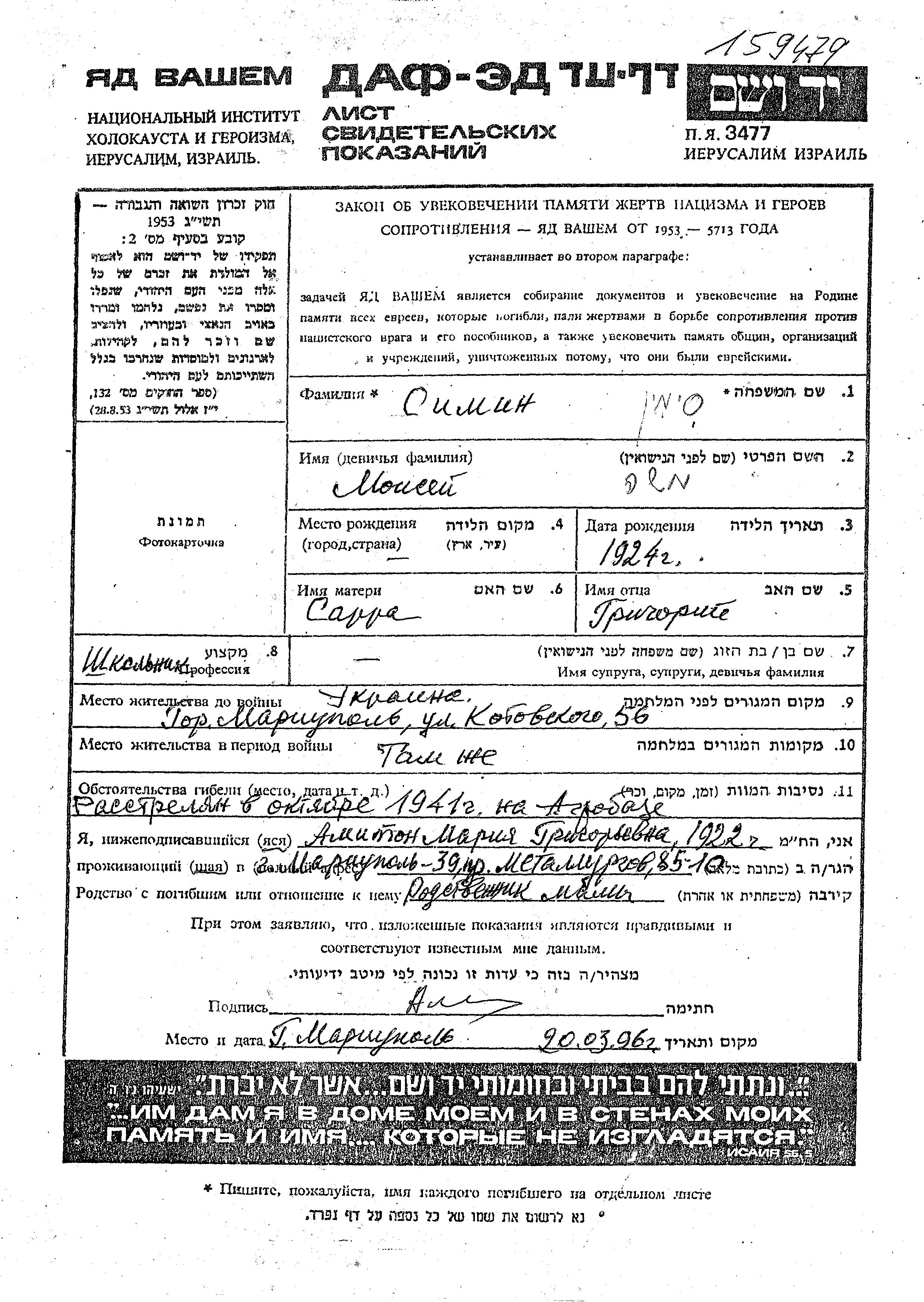 Simin Moisei 1924 Mariupol, Ukraine (URSS) Feuille de témoignage