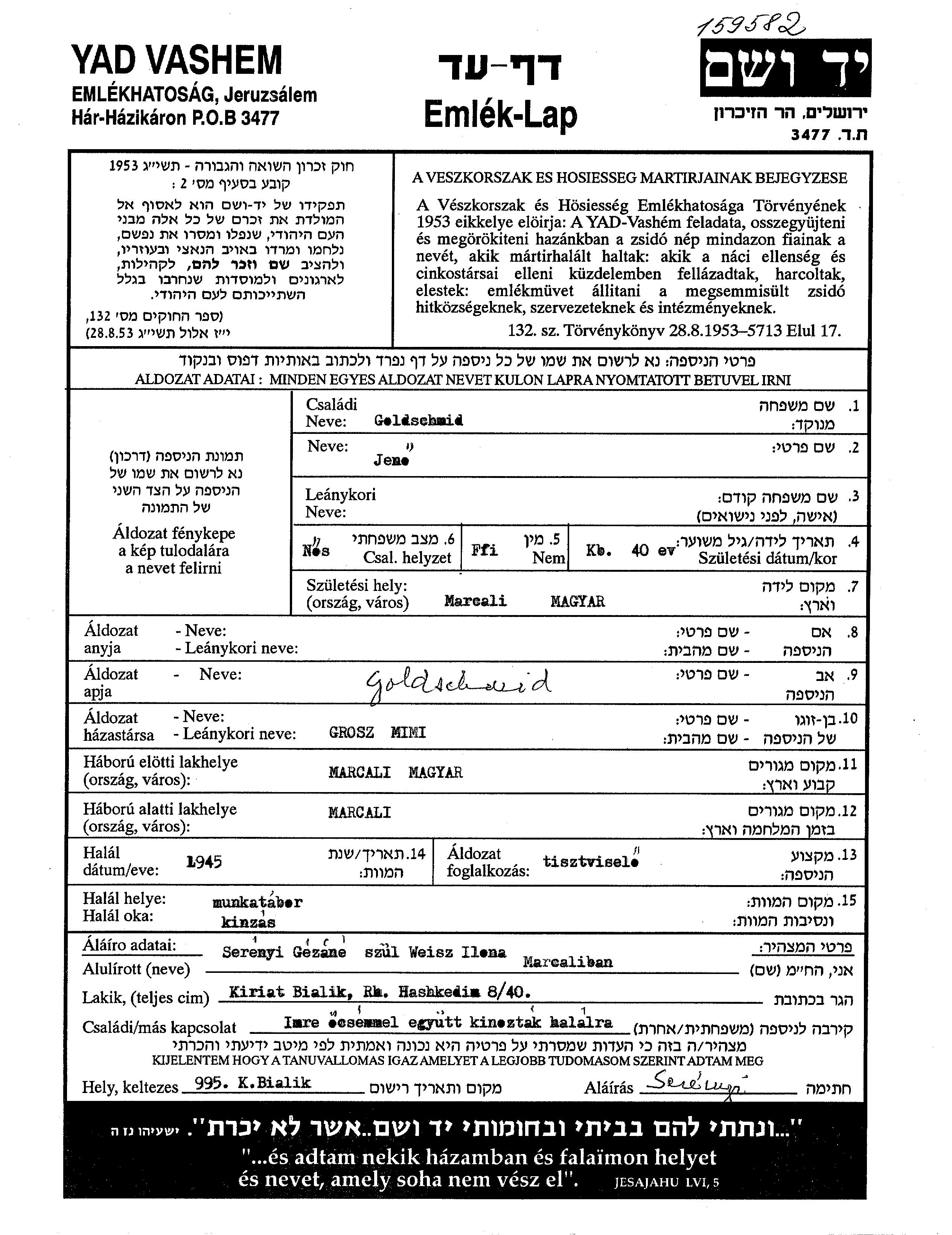 Goldschmid Jeno 1905 Marcali, Hongrie Feuille de témoignage