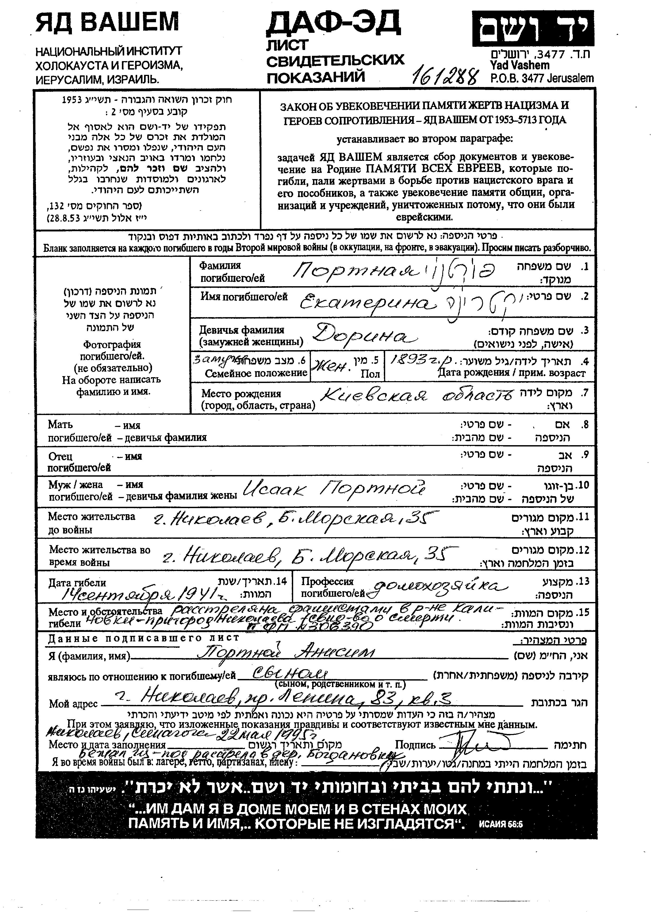 Portnoi Yekaterina 1893 Nikolayev, Ukraine (URSS) Feuille de témoignage