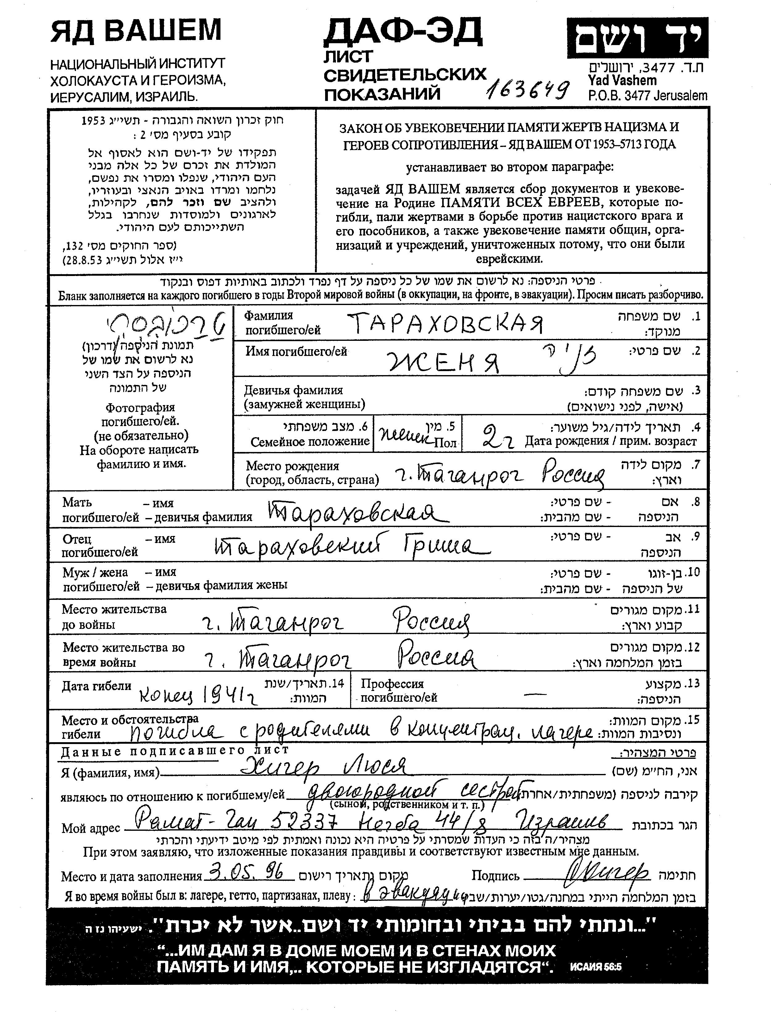 Tarakhovski Zhenia 1939 Taganrog, Russie (URSS) Feuille de témoignage