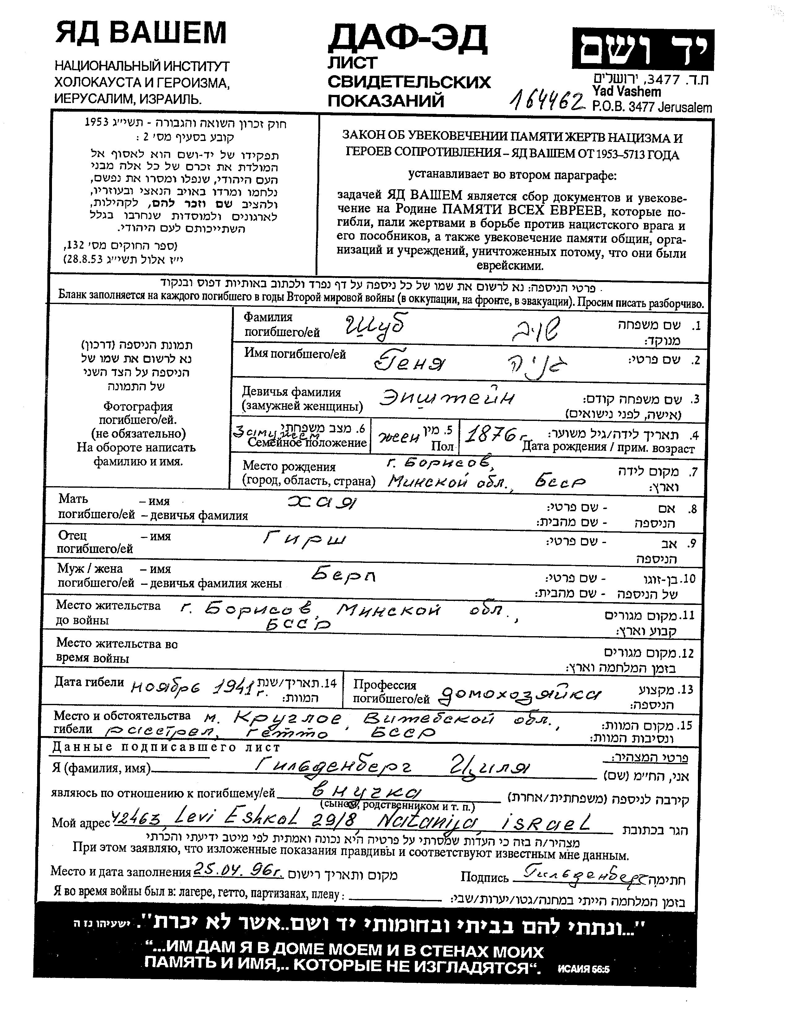 Genia Shub née Epshtein est née à Borisov, Bélorussie (URSS) en 1876, fille de Hirsh et de Khaia. Elle était Femme au foyer et Mariée à Berl. Avant la seconde guerre mondiale elle vivait à Borisov, Bélorussie (URSS).