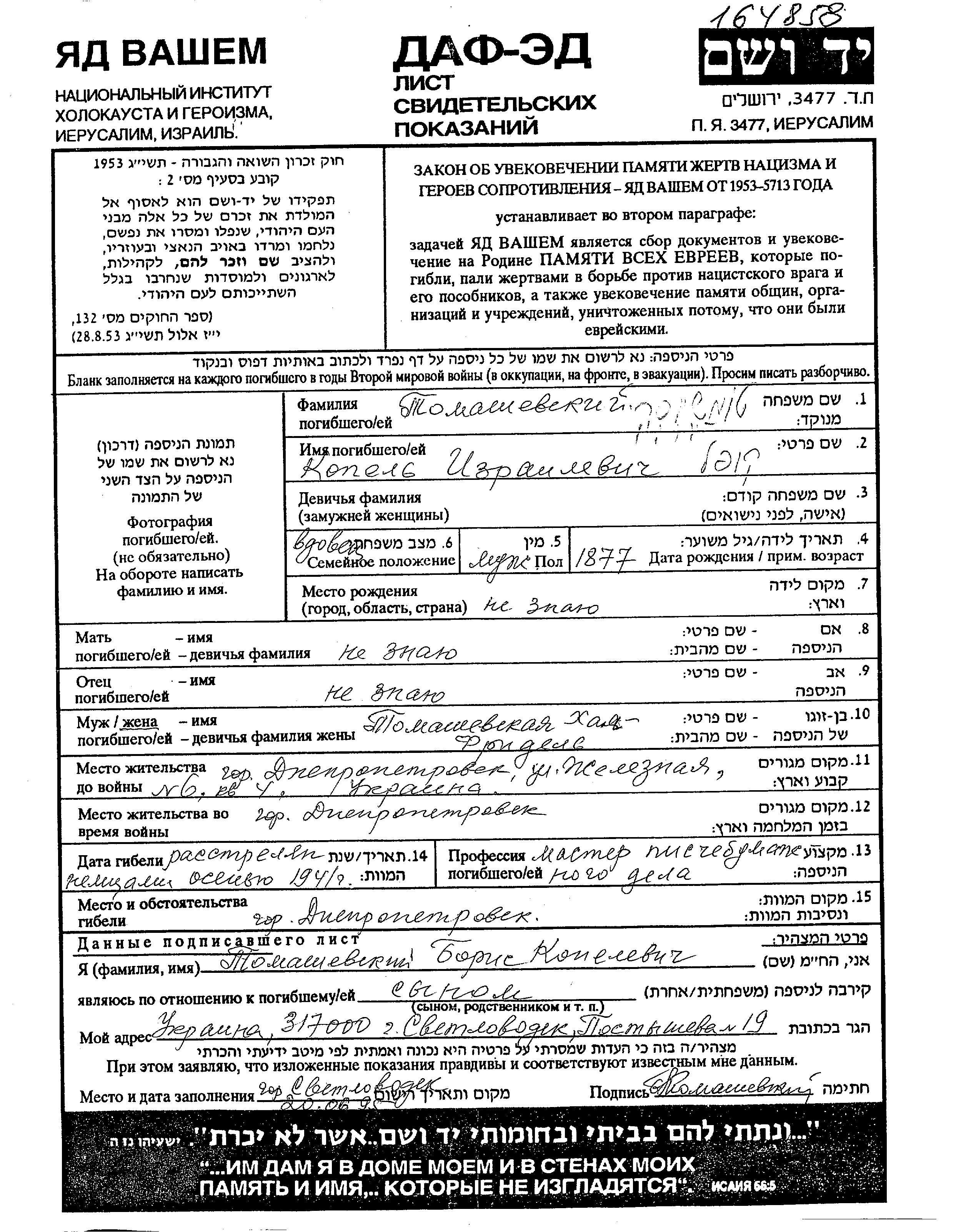 Kopel Tomashevski est né en 1877. Il était Chef d'équipe et Veuf de Khaia Fridl Fridel. Avant la seconde guerre mondiale il vivait à Dnepropetrovsk, Ukraine (URSS). Au cours de la guerre, il était à Dnepropetrovsk, Ukraine (URSS).