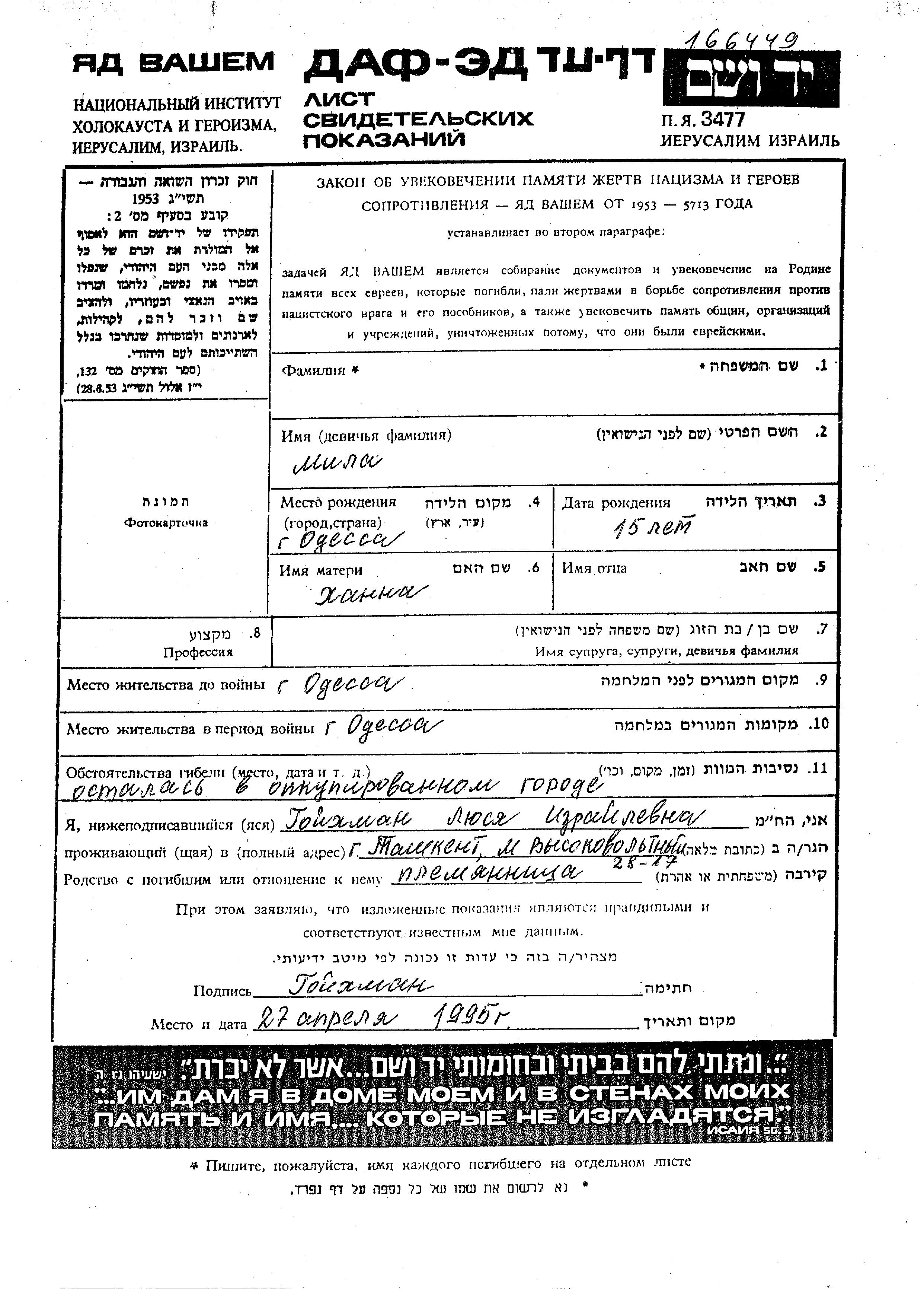 nom inconnu Mila Odessa, Ukraine (URSS) Feuille de témoignage