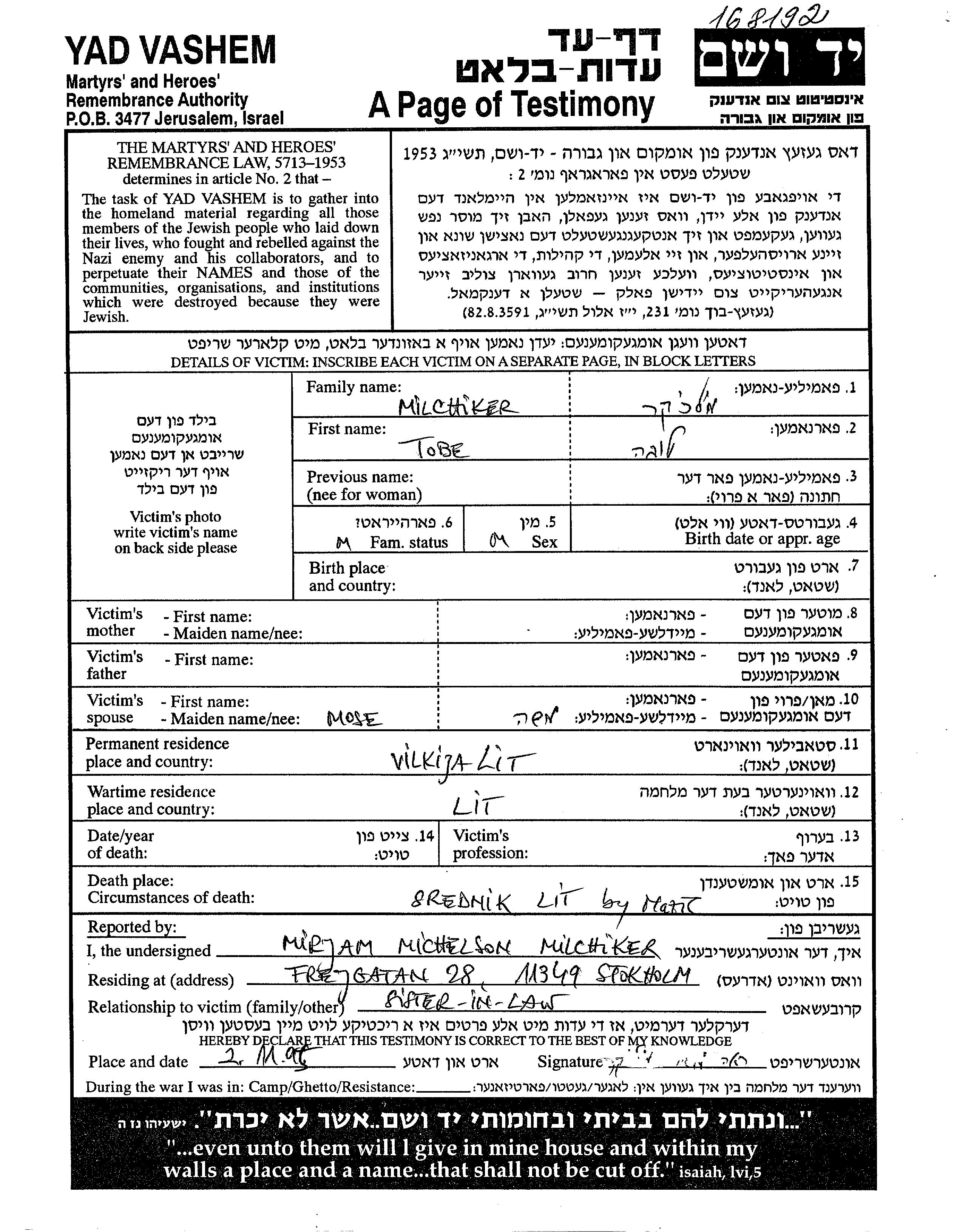 Milchiker Tobe Tova Vilkija, Lituanie Feuille de témoignage
