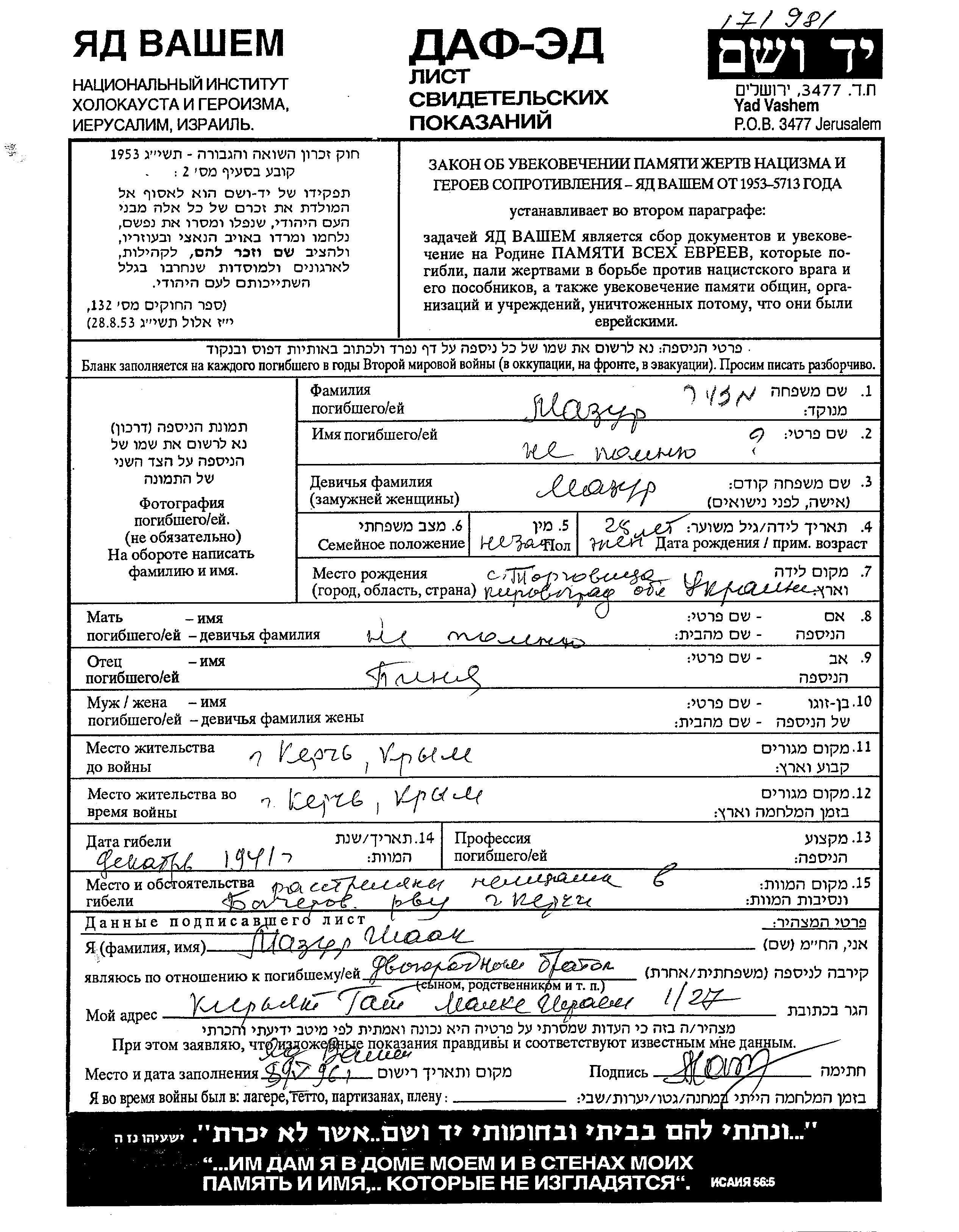 Mazur prénom inconnu 1913 Kerch, Russie (URSS) Feuille de témoignage
