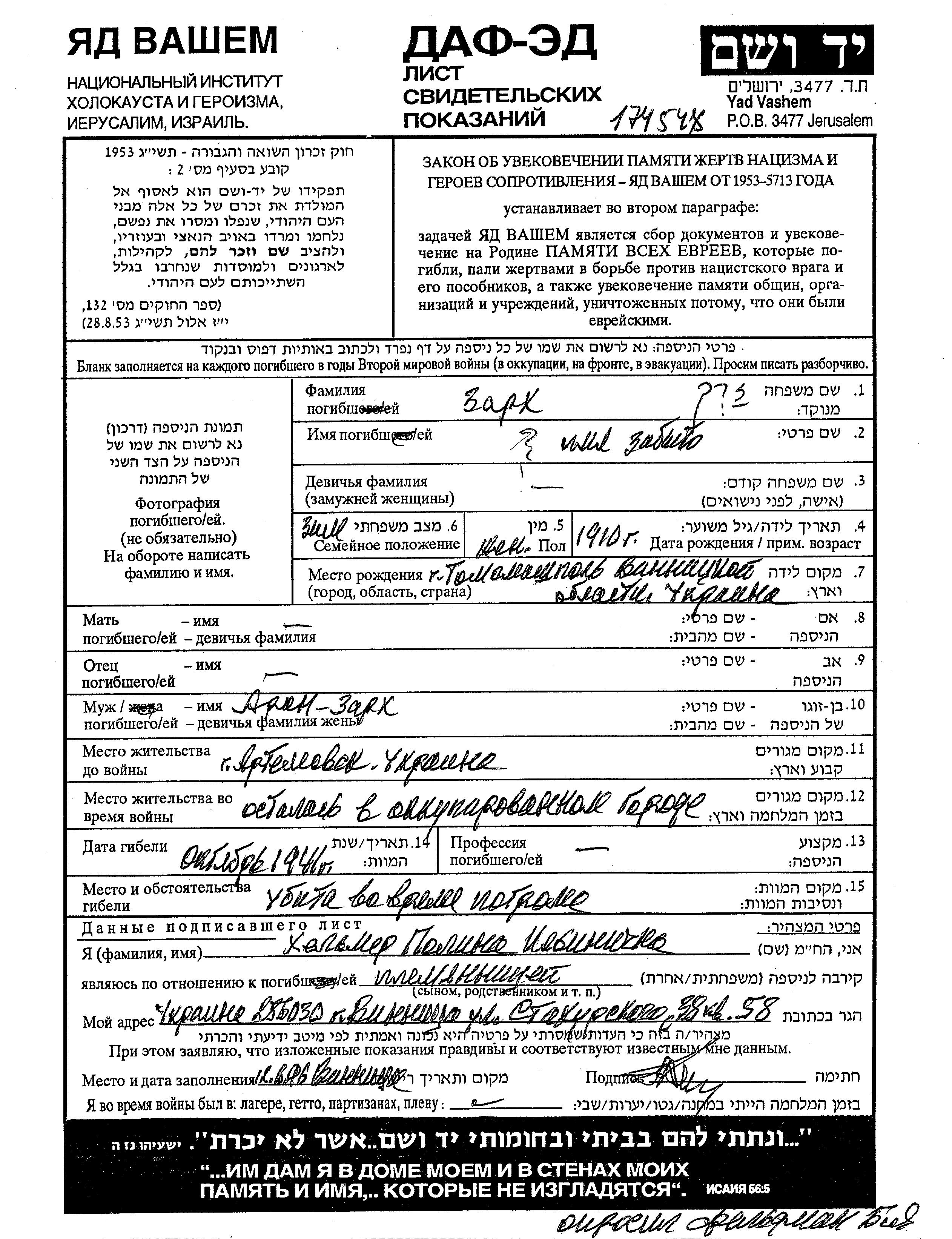 Zarkh prénom inconnu 1910 Artemovsk, Ukraine (URSS) Feuille de témoignage