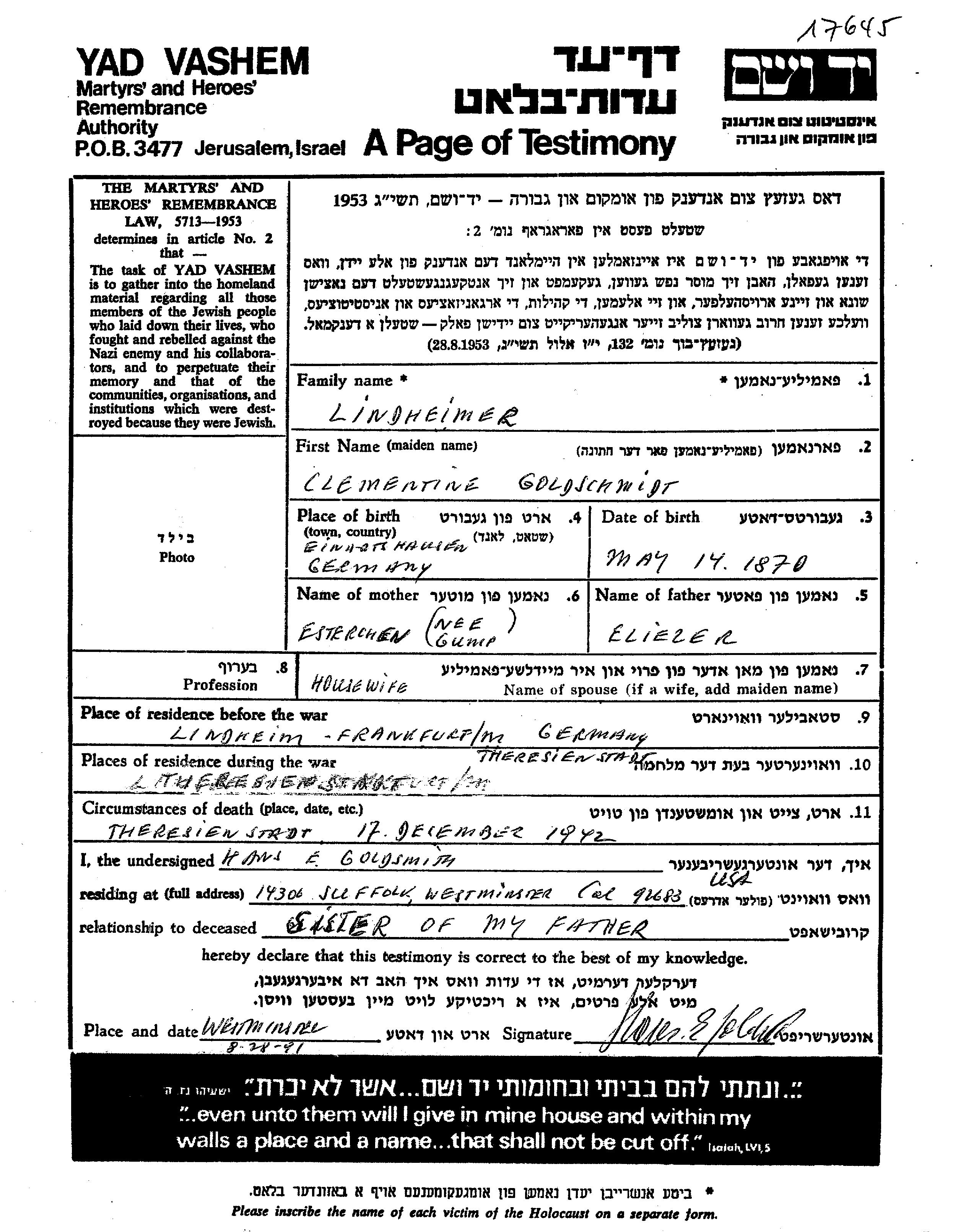 Clementine a été assassinée pendant la Shoah. Lieu de la mort: Theresienstadt, Tchécoslovaquie en 17/12/1942.