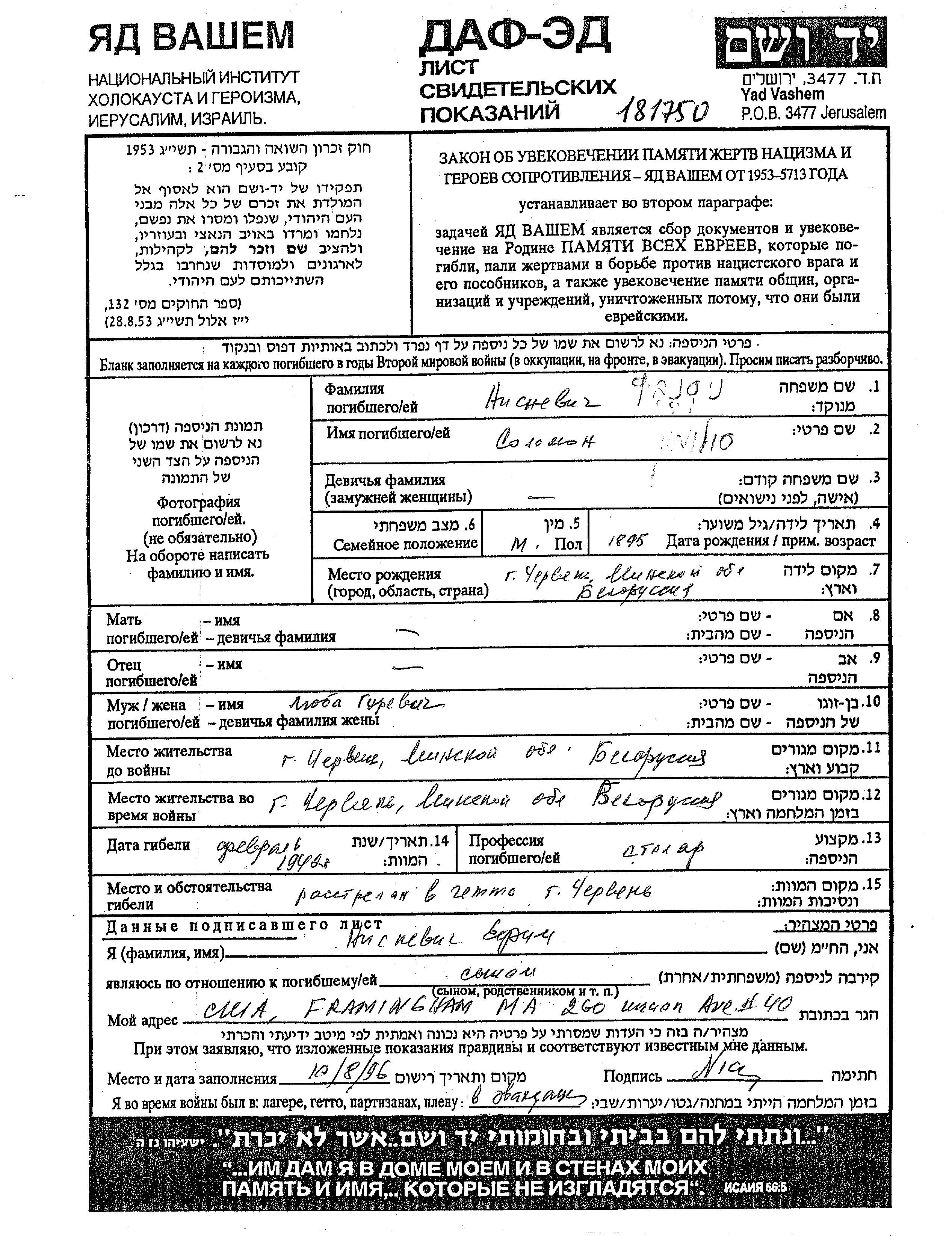 Nisnevich Solomon 1895 Cherven, Bélorussie (URSS) Feuille de témoignage