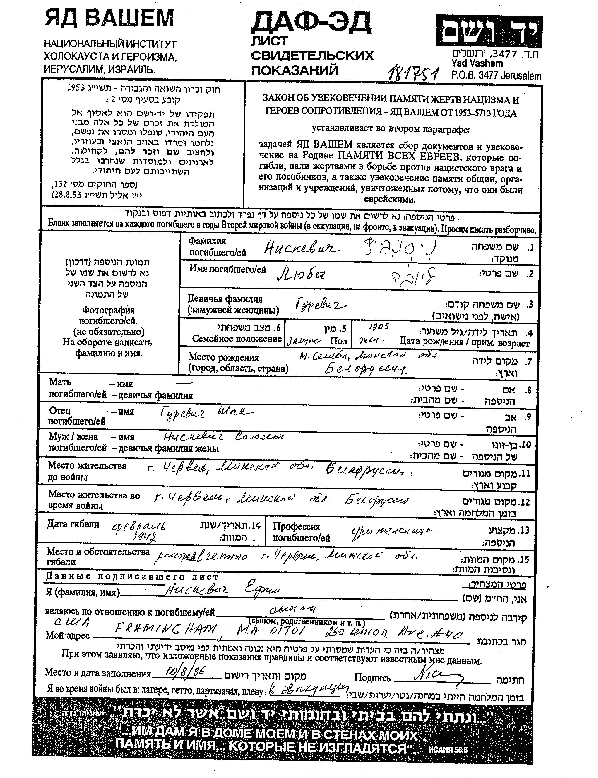 Nisnevich Lyuba 1895 Cherven, Bélorussie (URSS) Feuille de témoignage