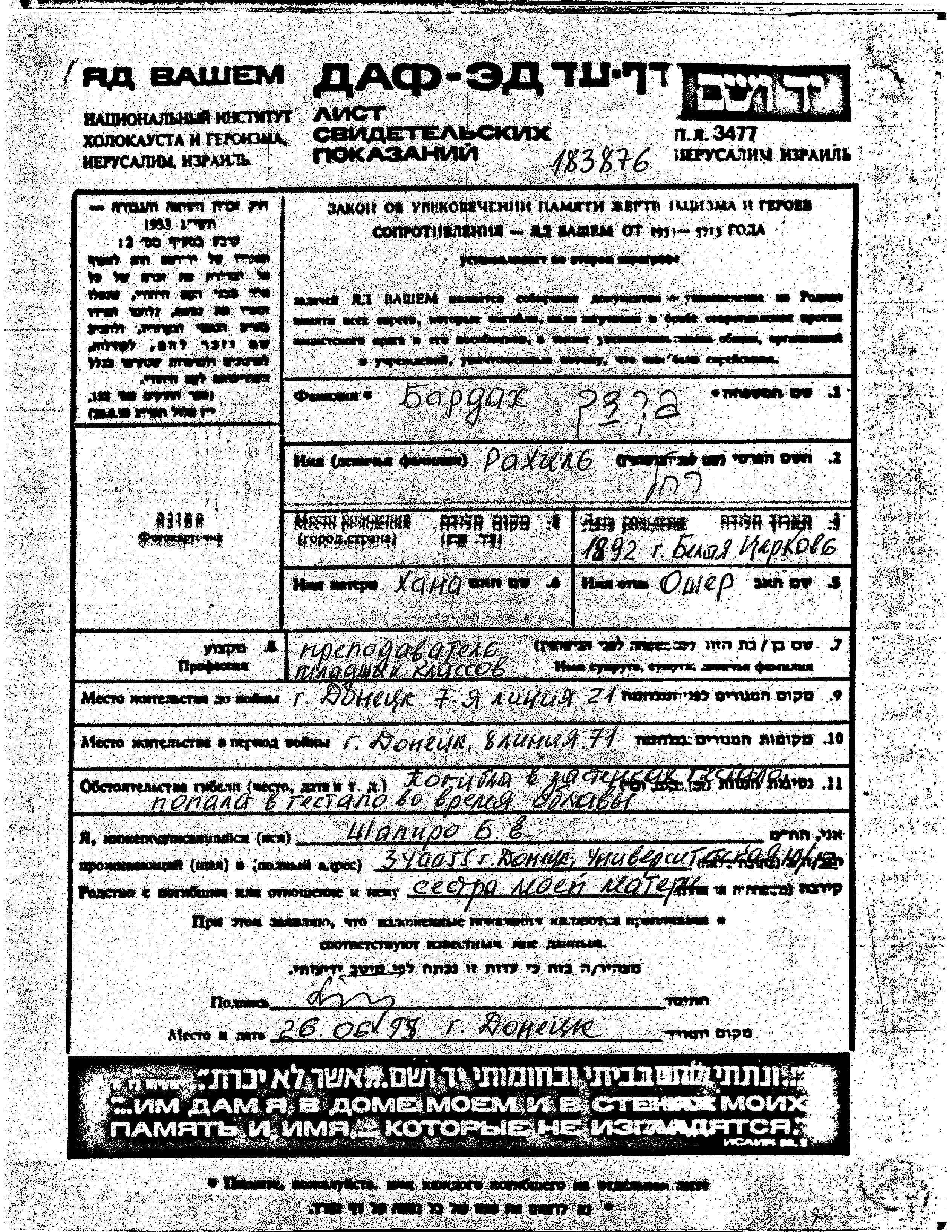 Bardakh Rakhil 1892 Donetsk, Ukraine (URSS) Feuille de témoignage