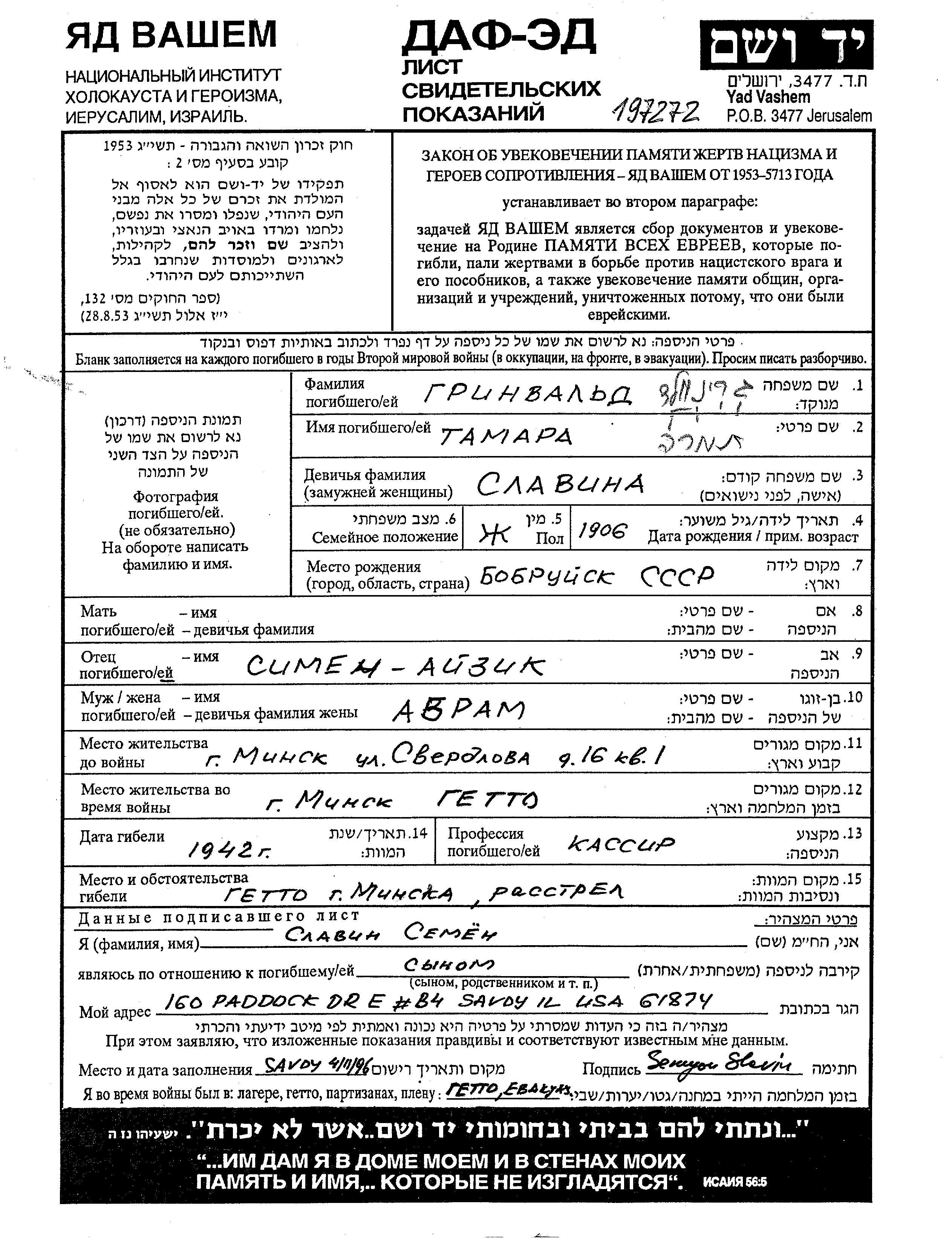 Grinvald Tamara 1906 Minsk, Bélorussie (URSS) Feuille de témoignage