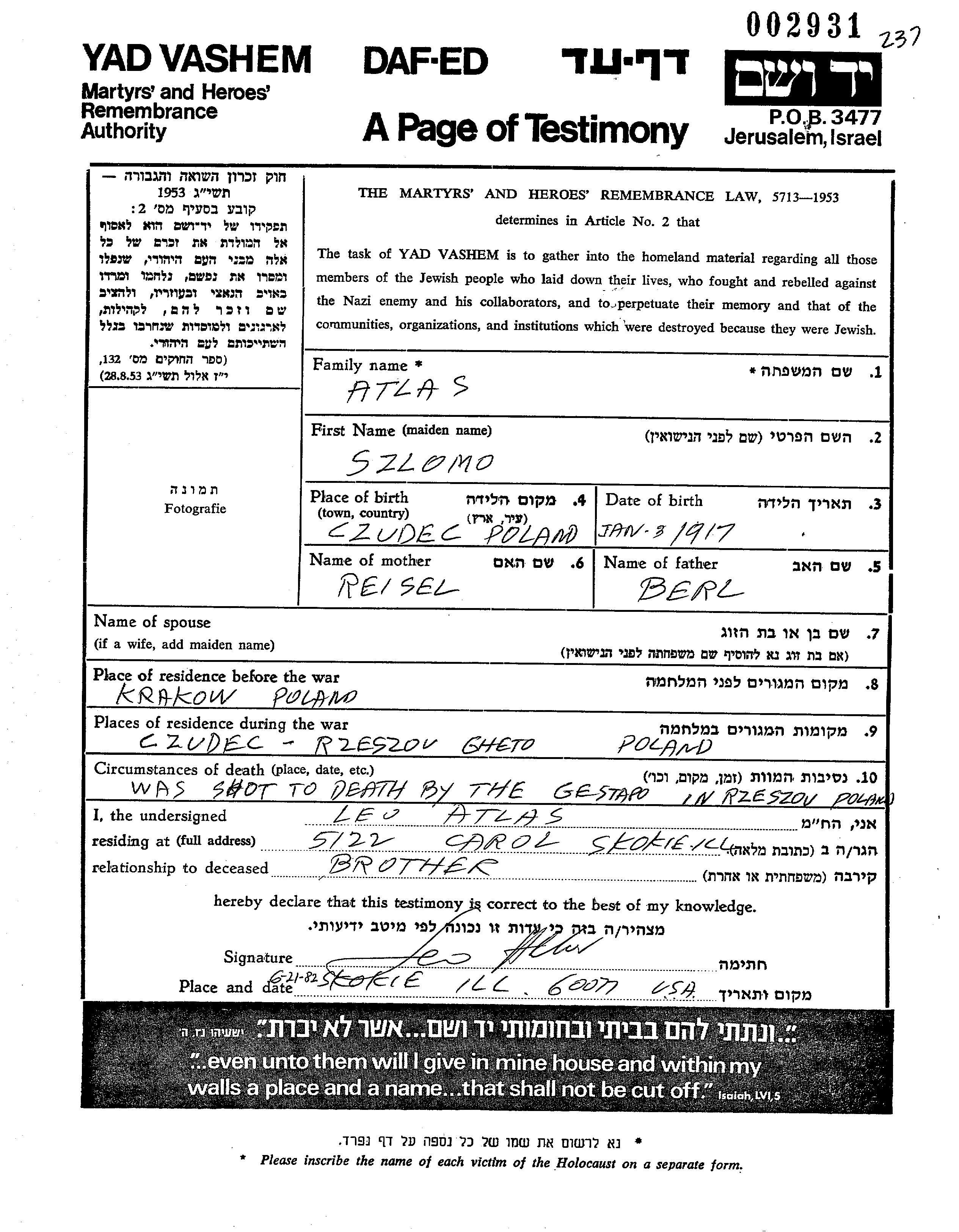 Szlomo Atlas est né à Czudec, Pologne en 1917, fils de Berl et de Reisel née Kile Keile. Avant la seconde guerre mondiale il vivait à Krakow, Pologne. Au cours de la guerre, il était à Czudec, Pologne.