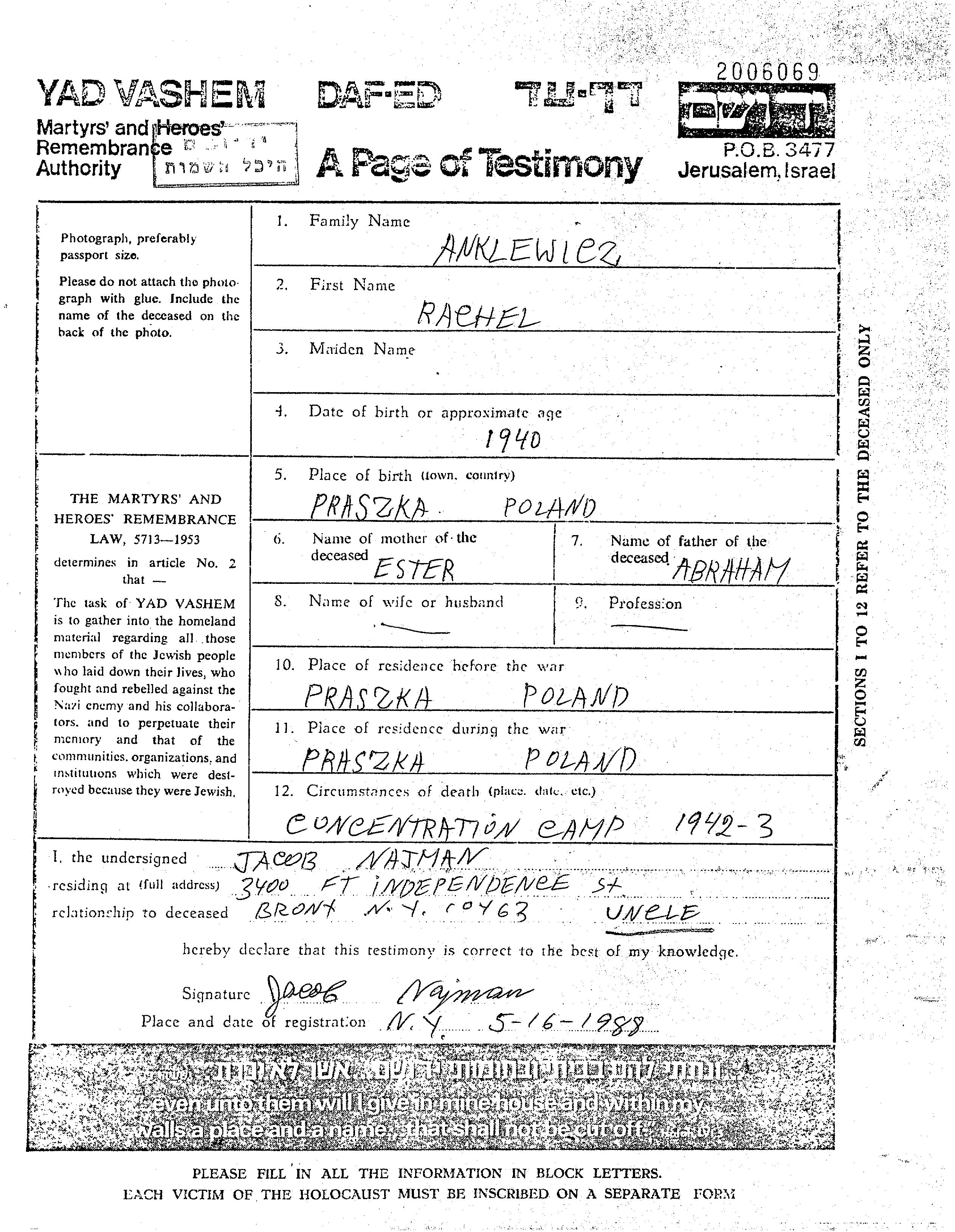 Anklewicz Rakhel 1940 Praszka, Pologne Feuille de témoignage