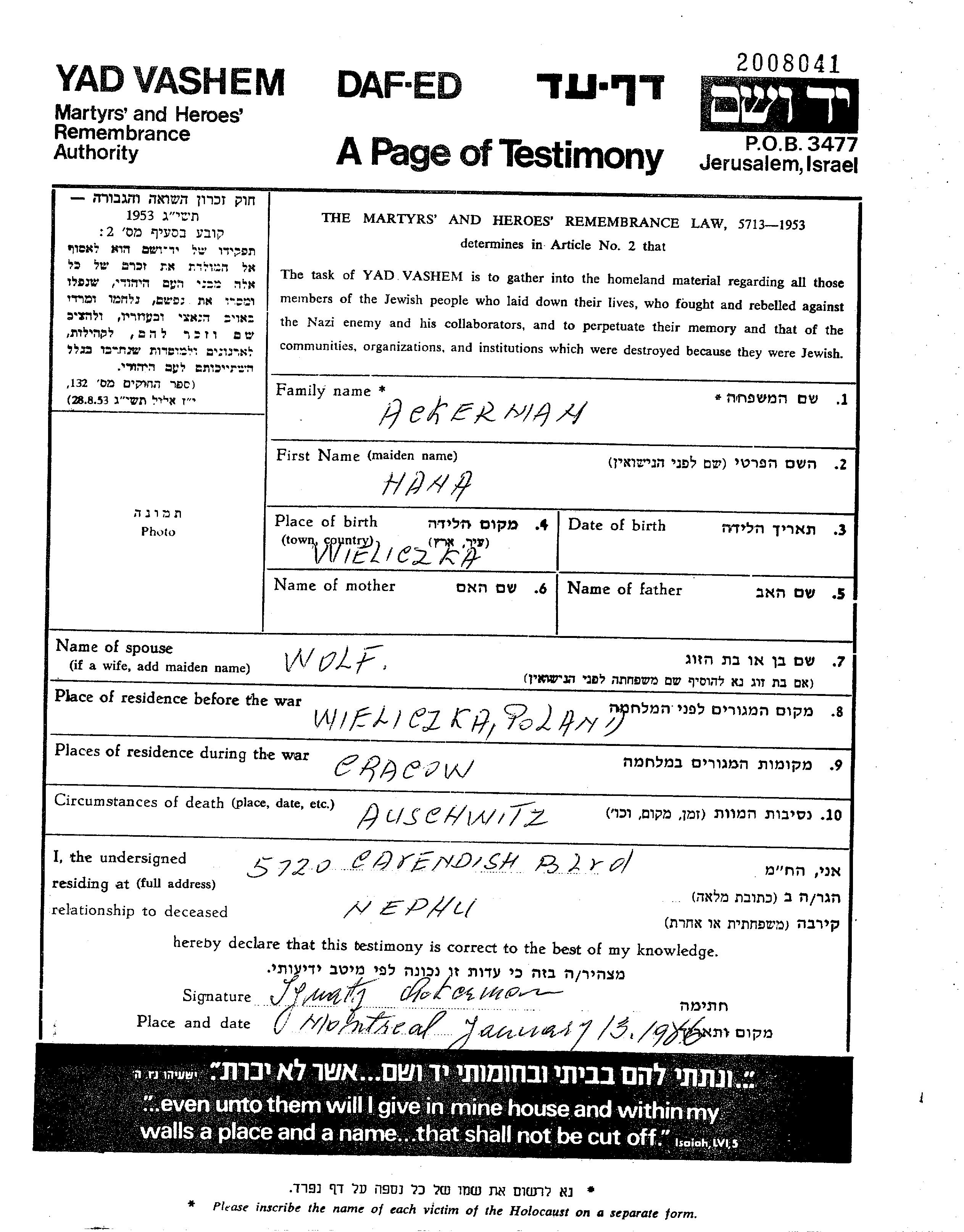 Ackerman Chana Wieliczka, Pologne Feuille de témoignage