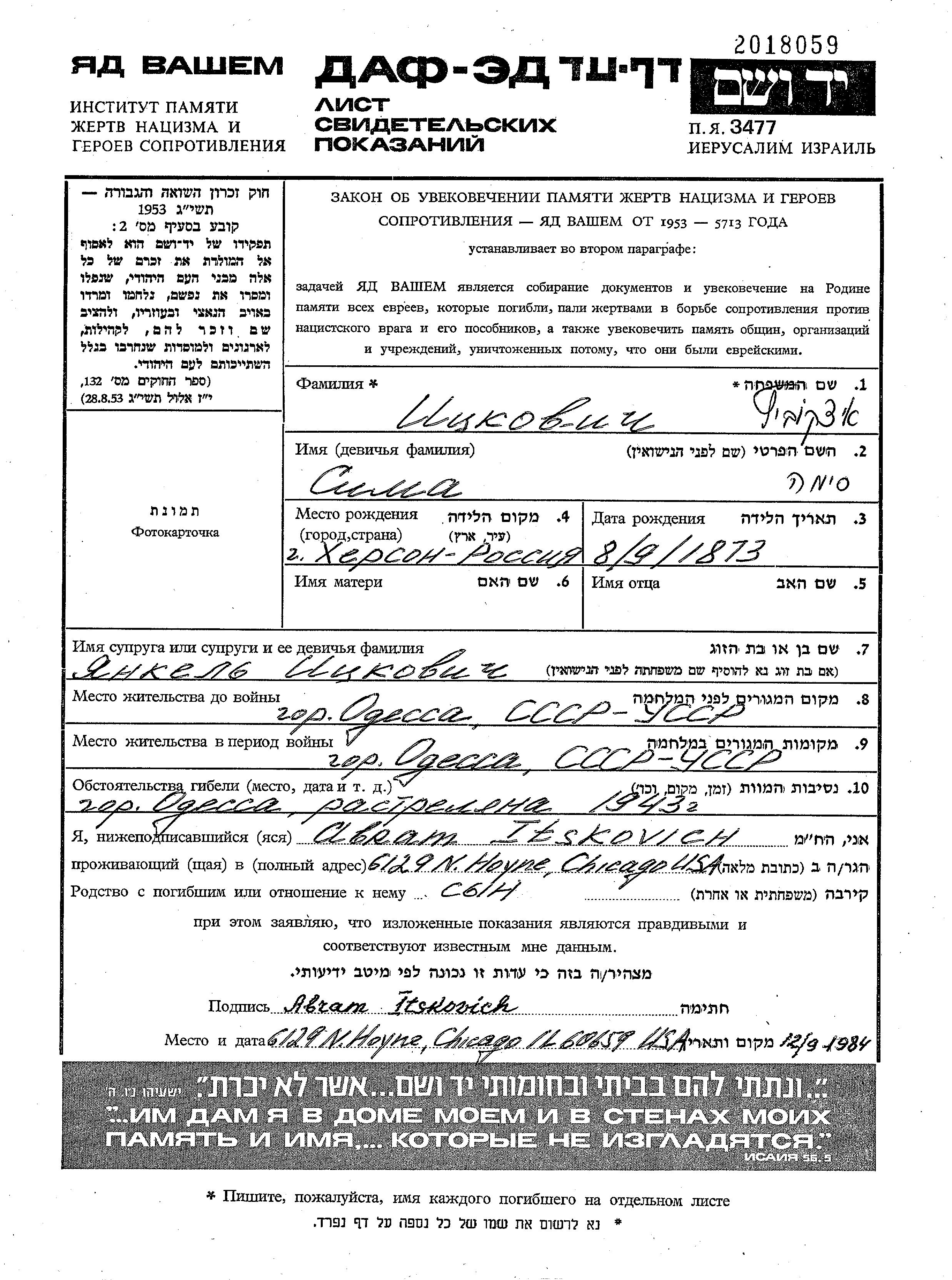 Itzkovich Sima 1873 Odessa, Ukraine (URSS) Feuille de témoignage