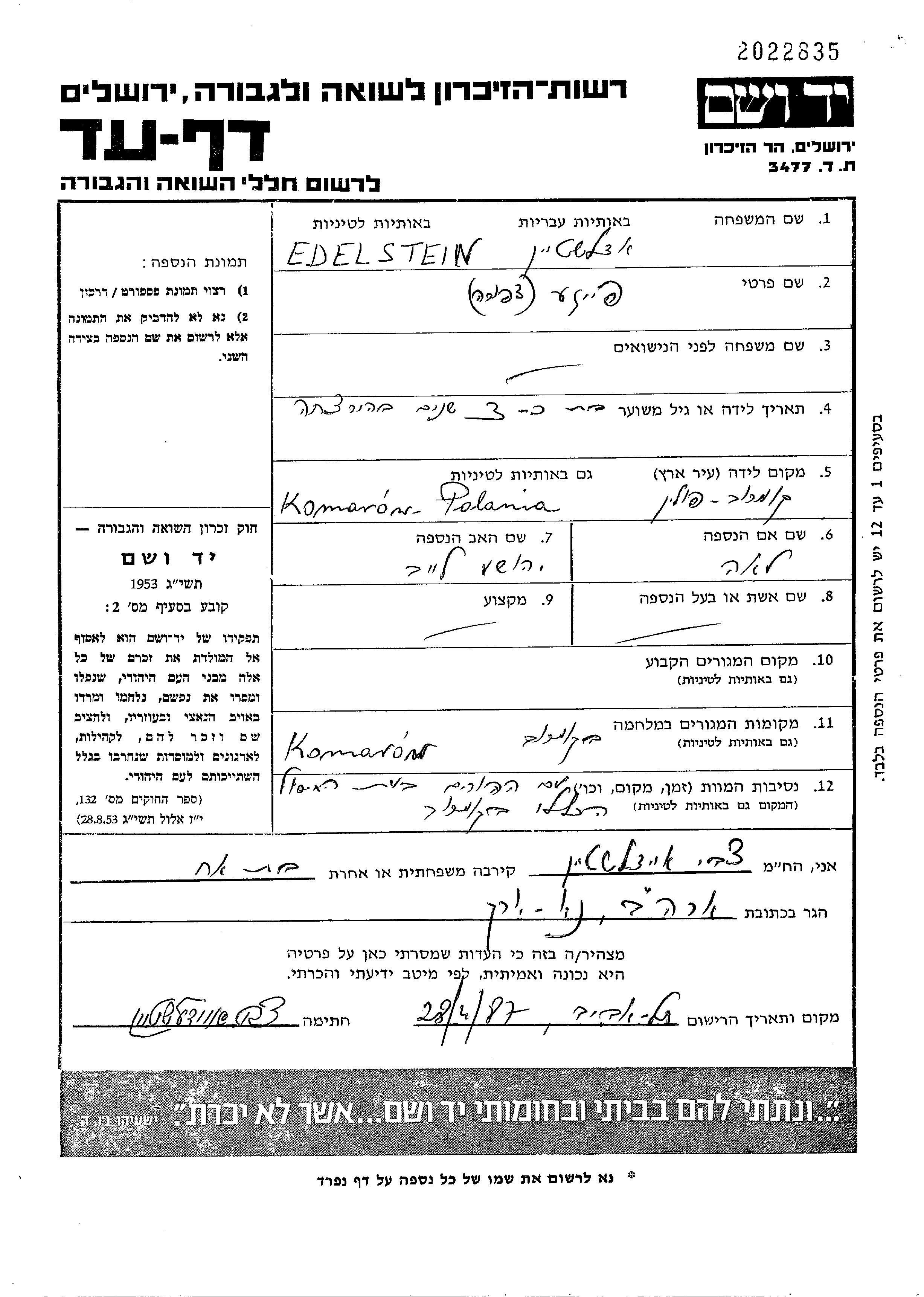 Edelstein Tzipora Feiga endroit inconnu, Feuille de témoignage