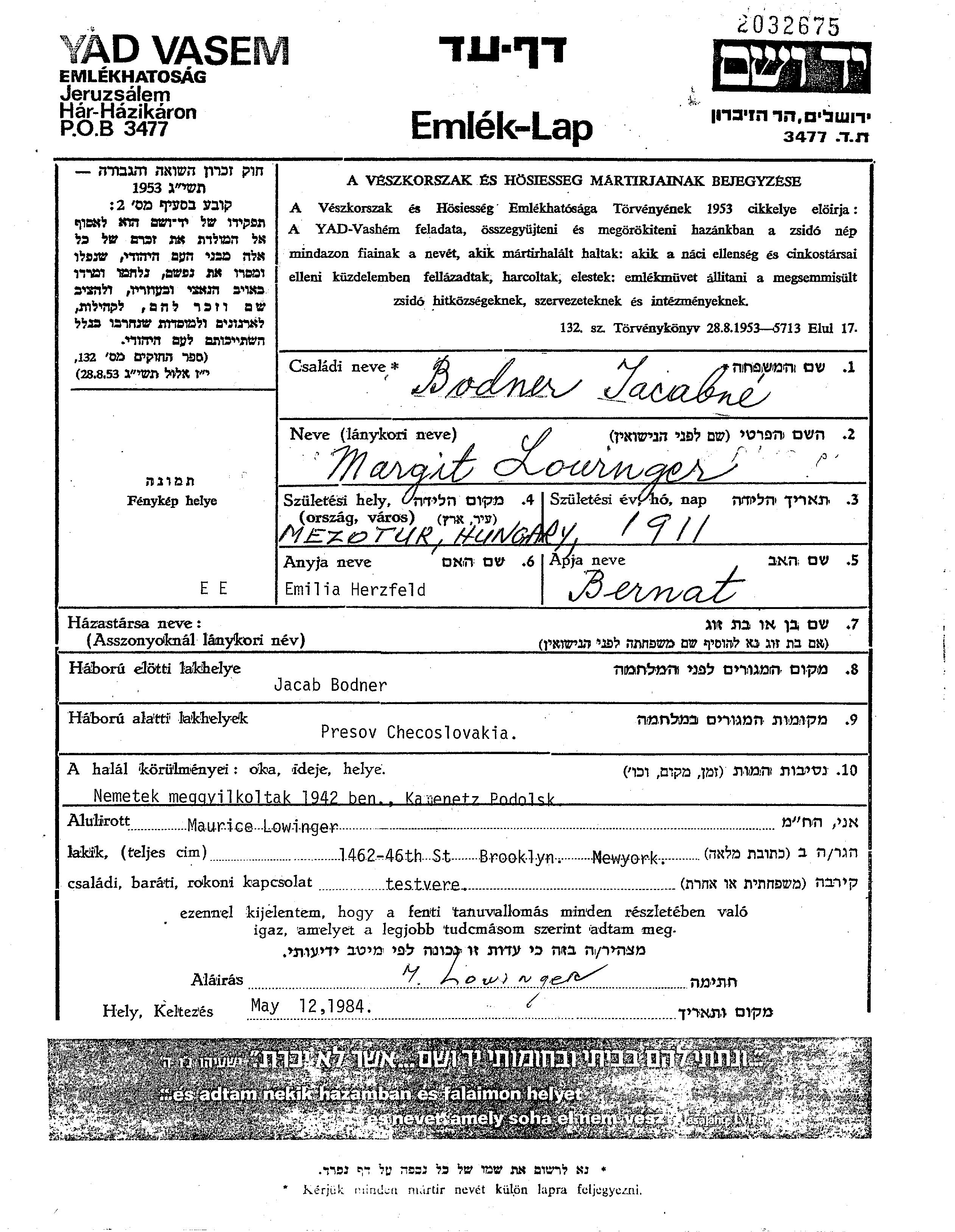 Margit Bodner née Lowinger est née à Mezotur, Hongrie en 1911, fille de Bernat et de Emilia née Herzfeld. Elle était Mariée à Jacab. Pendant la guerre, elle était à Presov, Tchécoslovaquie.