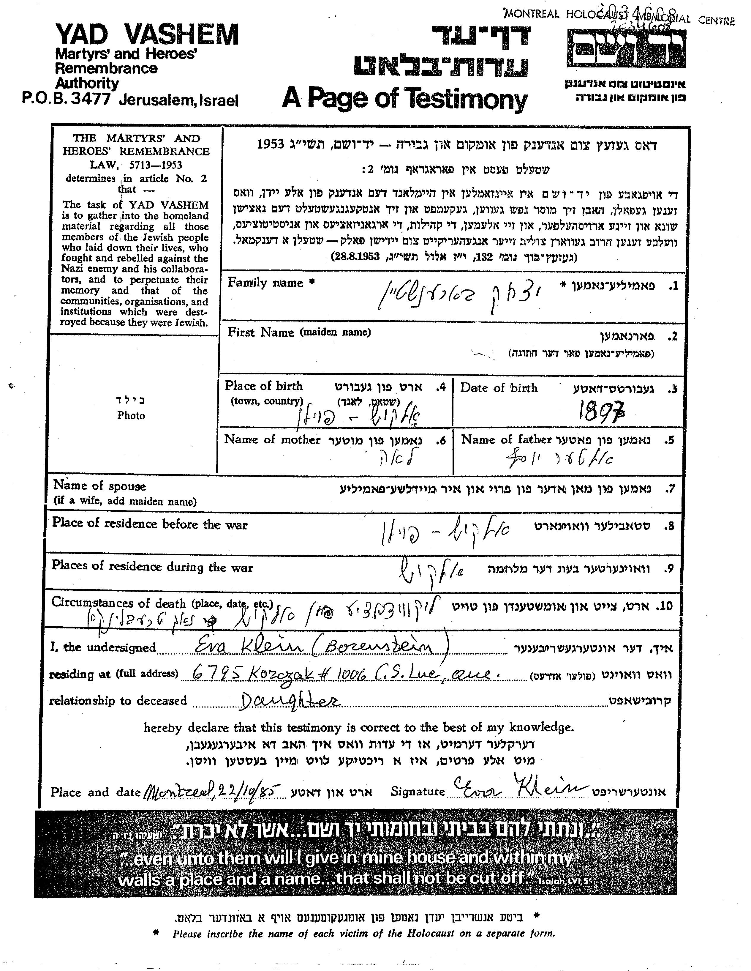 Borenstein Ytzkhak 1897 Olkusz, Pologne Feuille de témoignage
