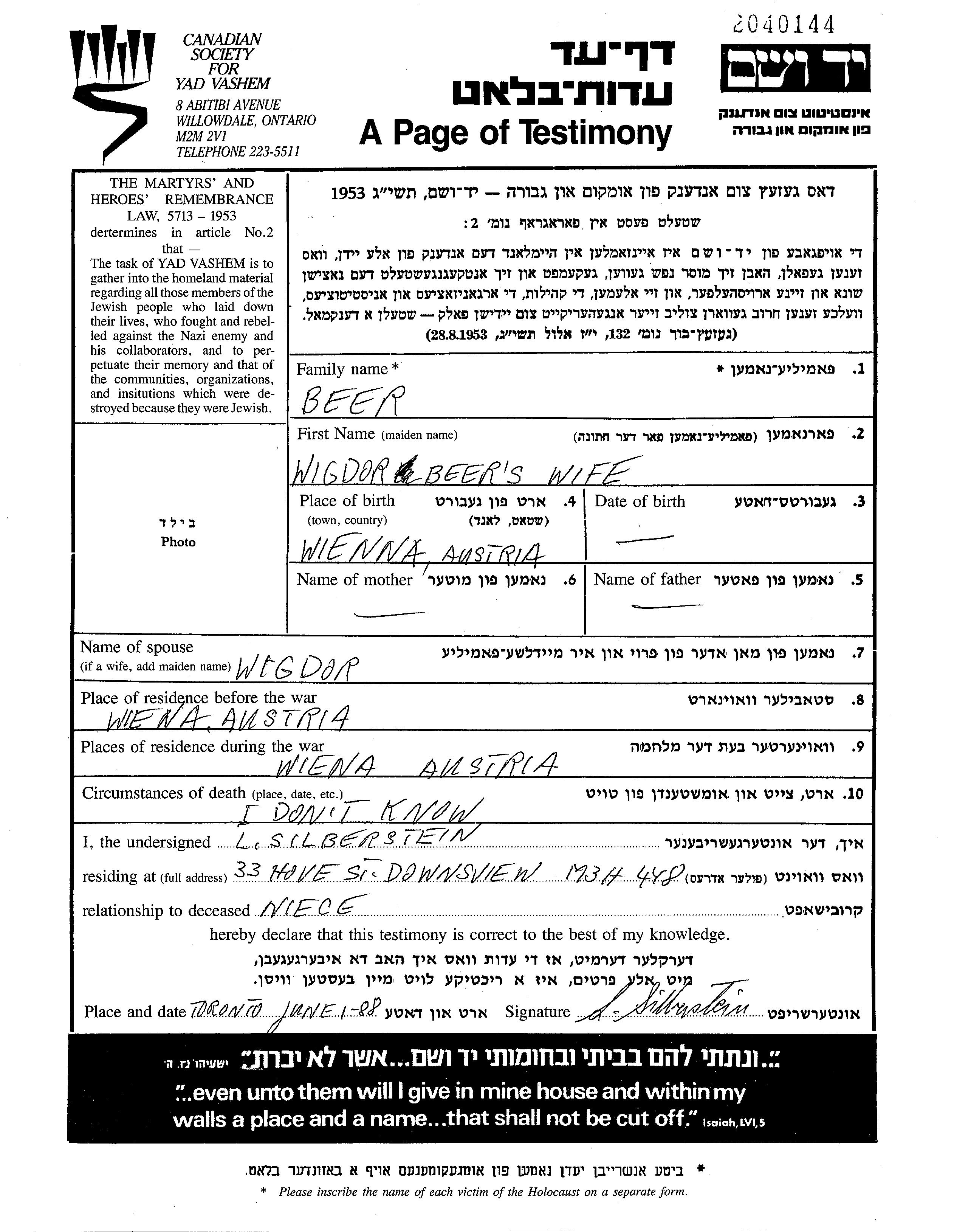 prénom inconnu Beer est née à Wien, Autriche. Elle était Mariée à Wigdor. Avant la seconde guerre mondiale elle vivait à Wien, Autriche. Pendant la guerre, elle était à Wien, Autriche.