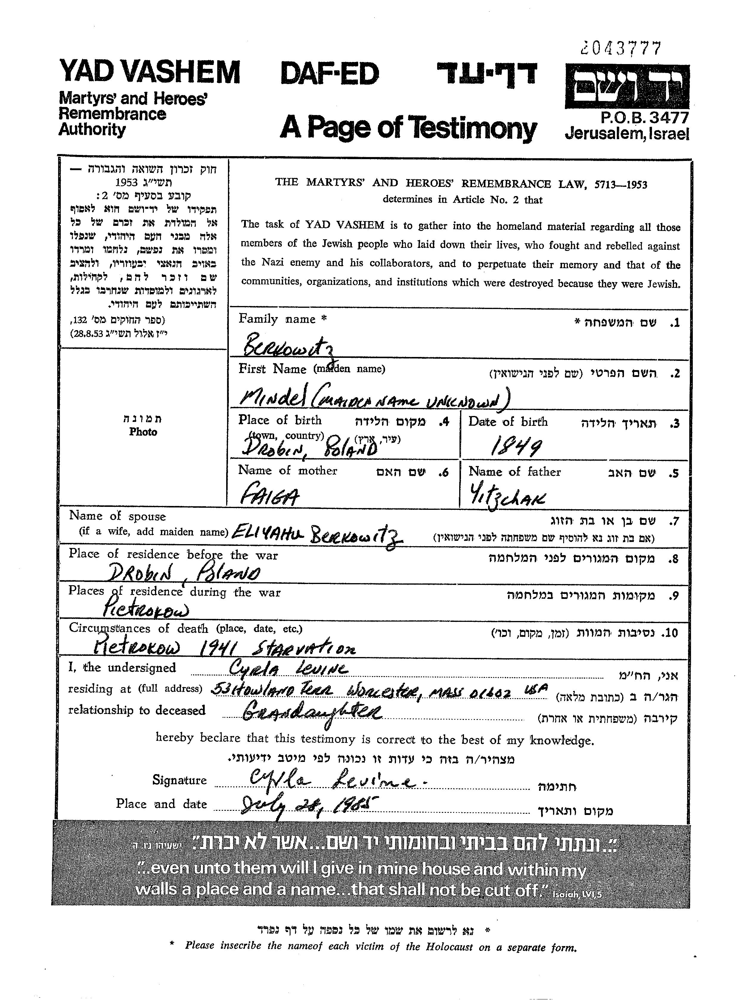 Mindl Berkowitz est née à Drobin, Pologne en 1849, fille de Yitzchak et de Faiga. Elle était Mariée à Eliyahu. Avant la seconde guerre mondiale elle vivait à Drobin, Pologne. Pendant la guerre, elle était à Piotrkow Kujawski, Pologne.