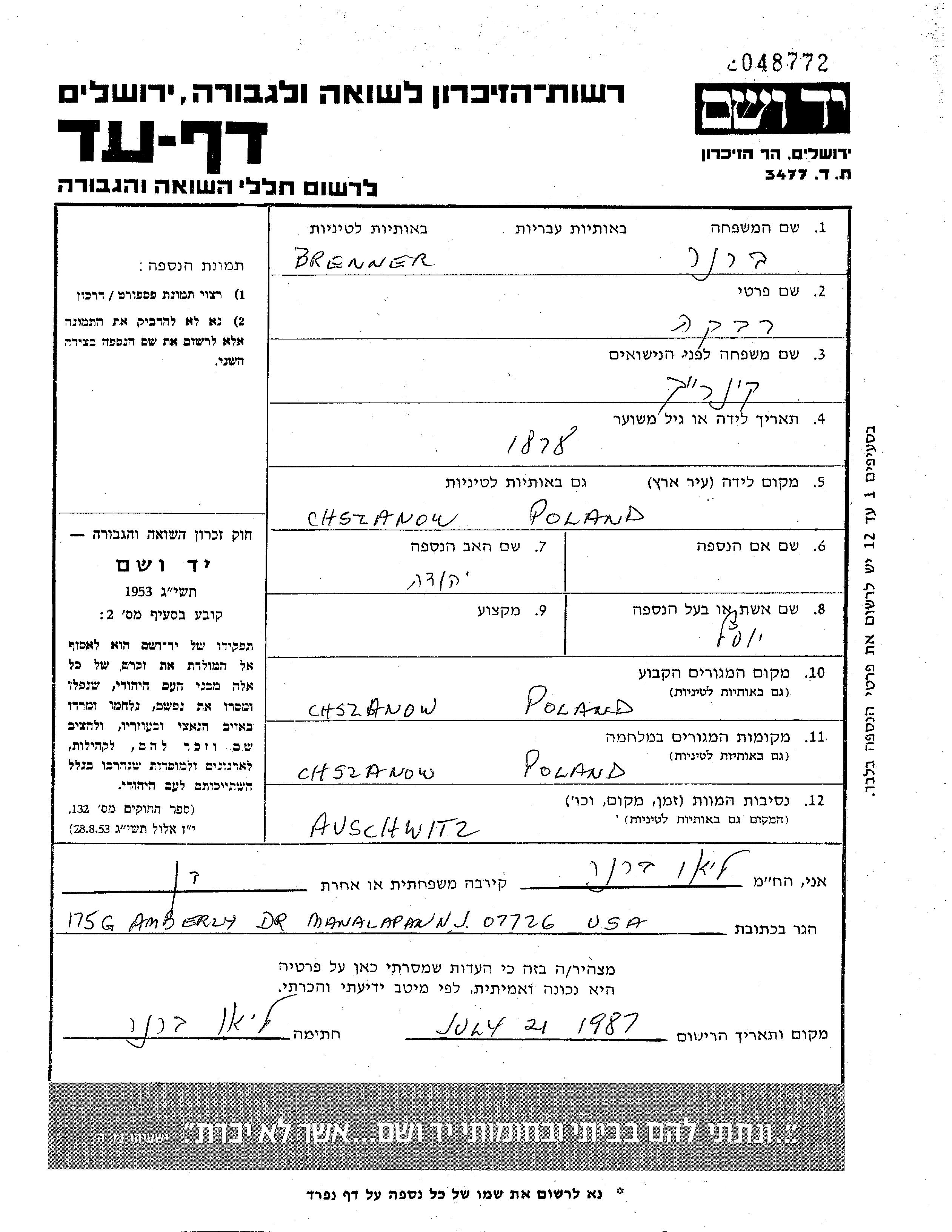 Brenner Rivka 1878 Chrzanow, Pologne Feuille de témoignage