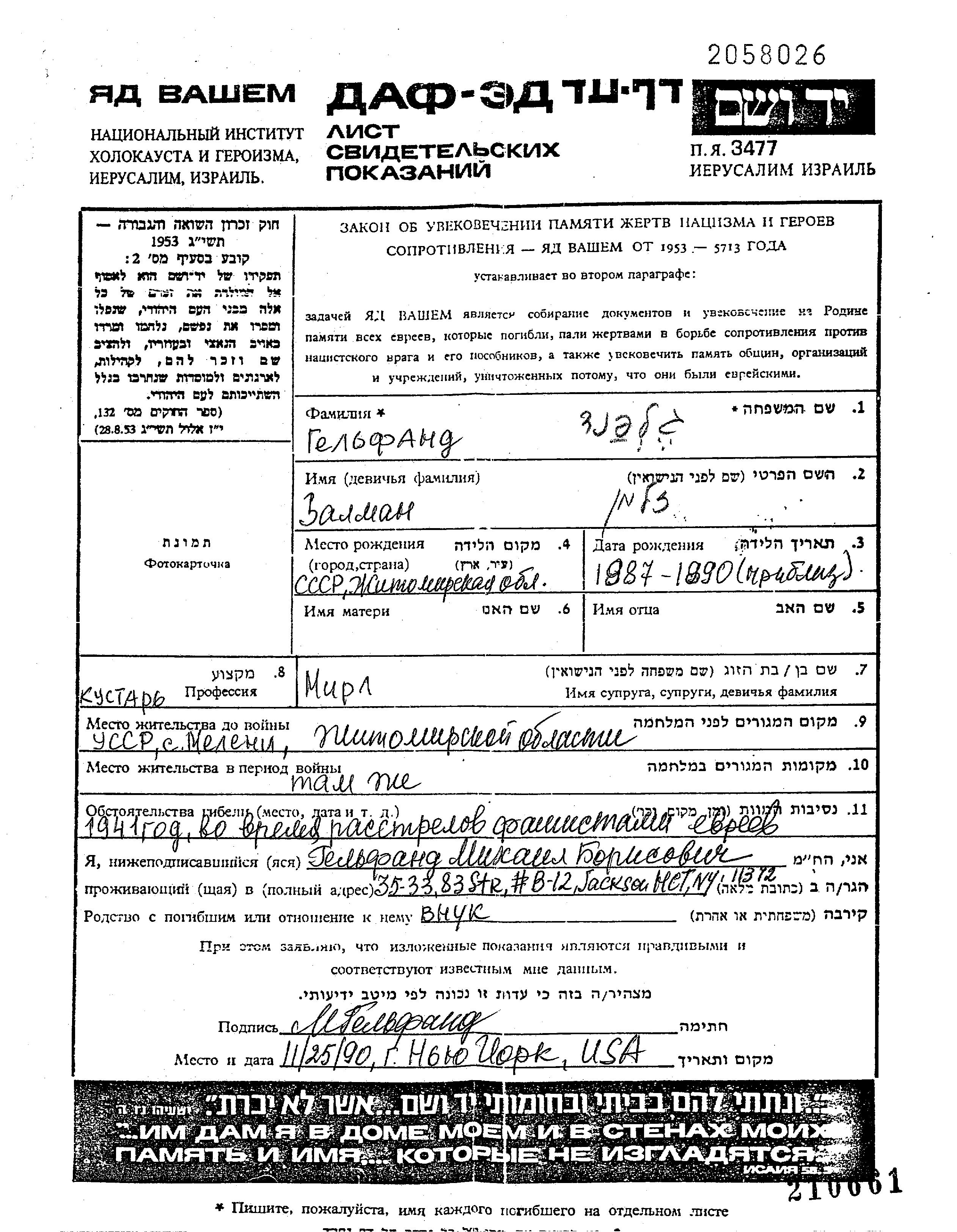 Zalman Gelfand est né à Zhitomir, Ukraine (URSS) en 1888. Il était Artisan et Mariée à Mirl. Avant la seconde guerre mondiale il vivait à Meleni, Ukraine (URSS). Au cours de la guerre, il était à Meleni, Ukraine (URSS).