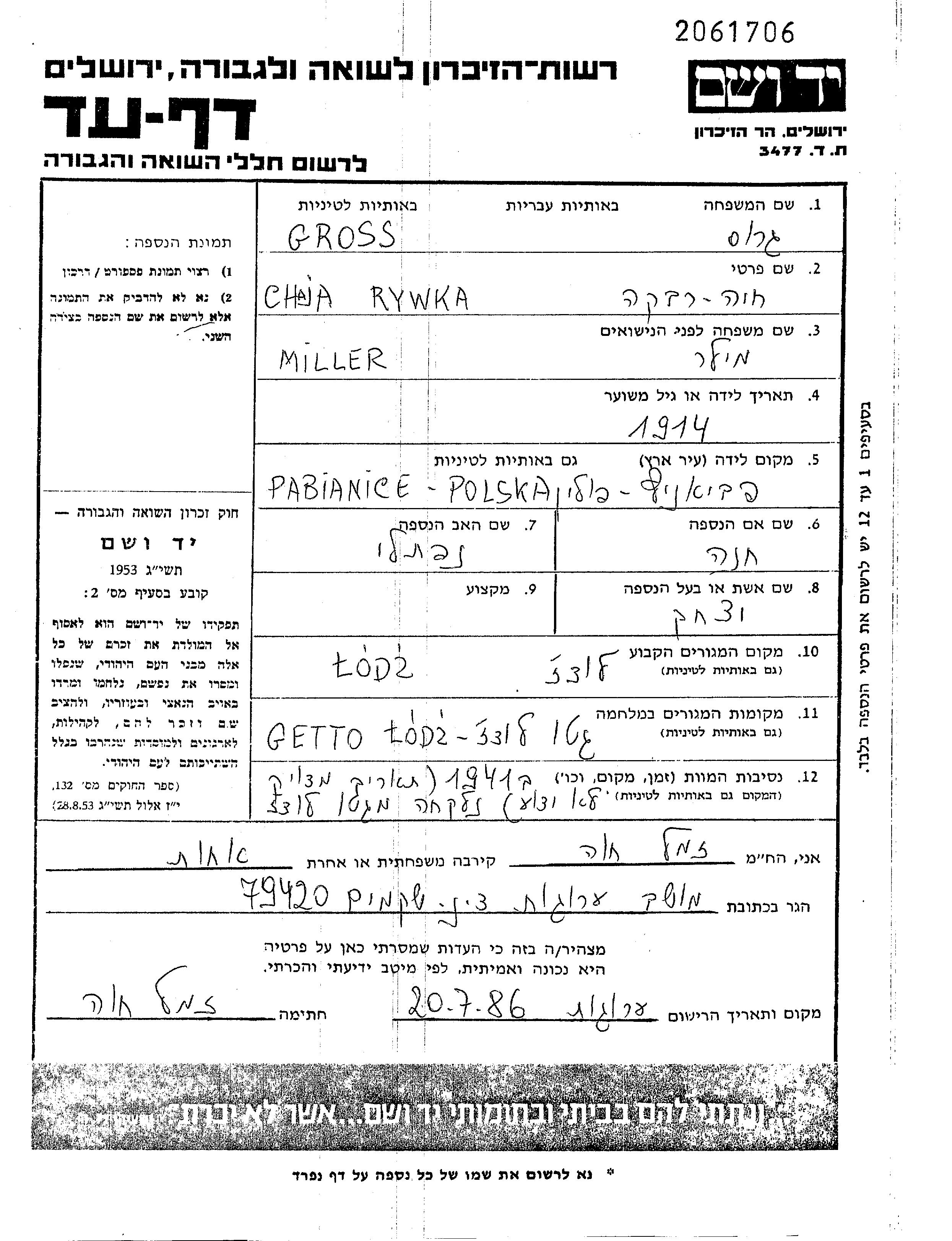 Chaja Rywka Gross née Miller est née à Pabianice, Pologne en 1914, fille de Naftali et de Khana. Elle était Mariée à Ytzkhak. Avant la seconde guerre mondiale elle vivait à Lodz, Pologne. Pendant la guerre, elle était à Lodz, Pologne.