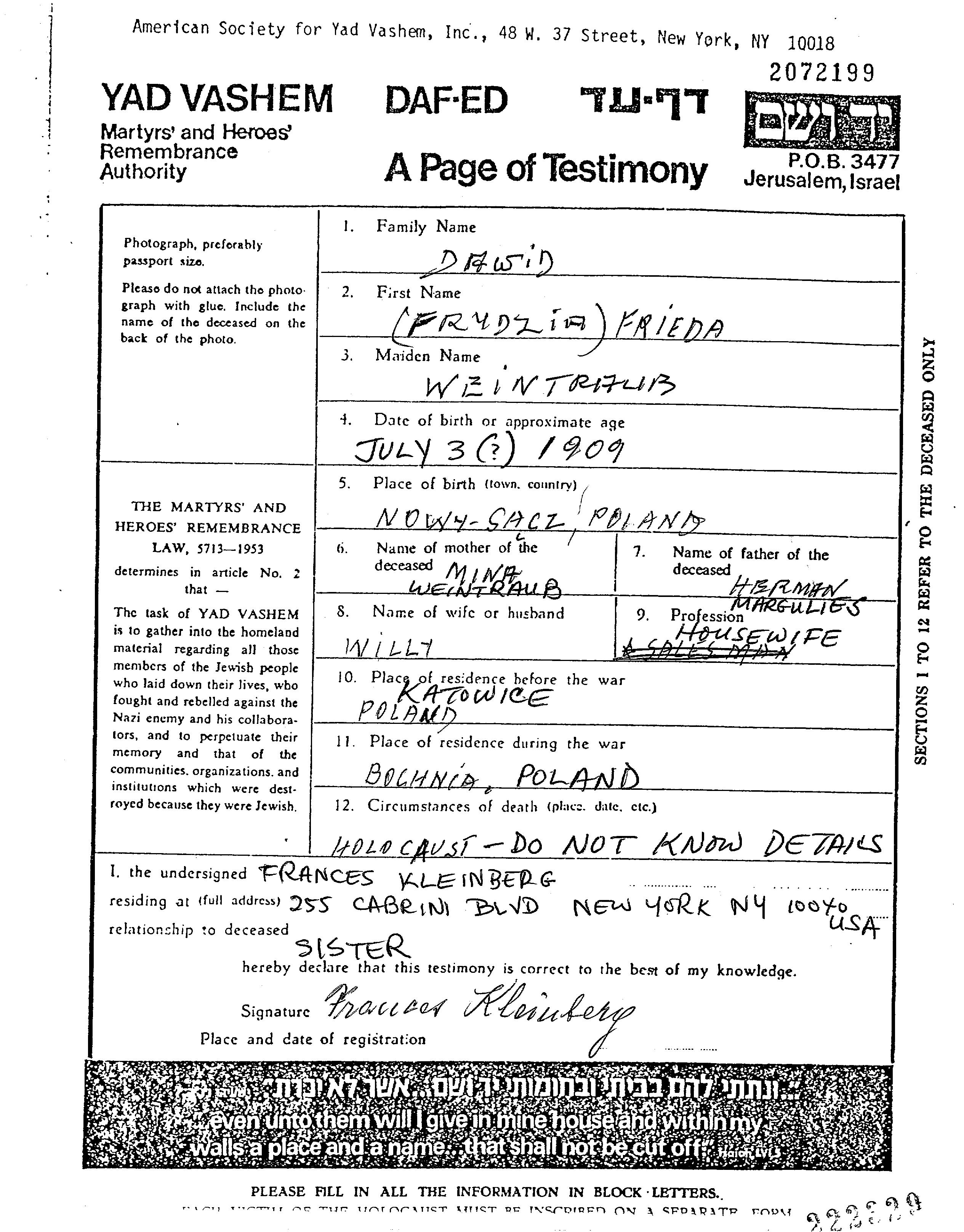 Dawid Frydzia 1909 Katowice, Pologne Feuille de témoignage
