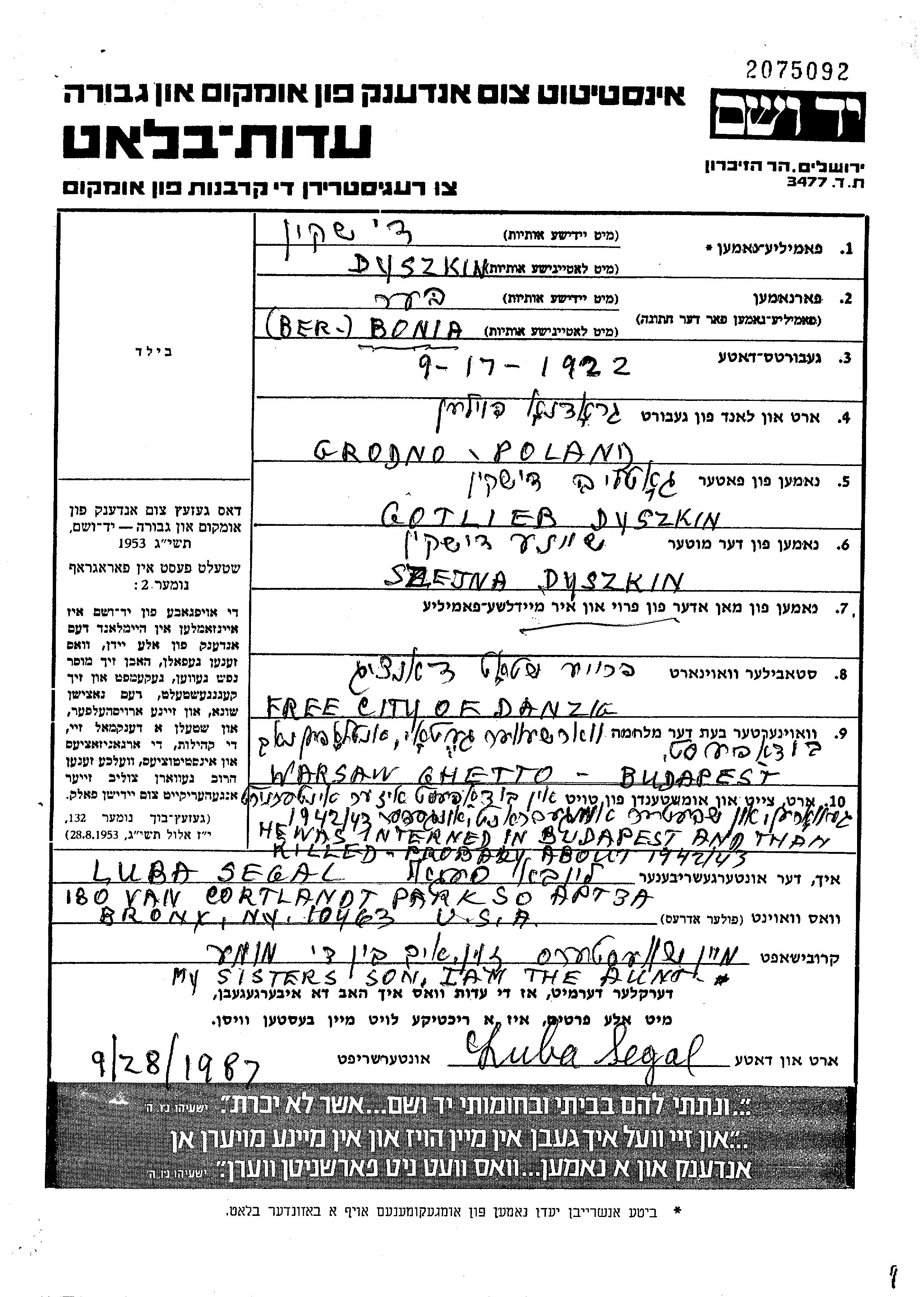 Bonia Ber Dyszkin est né à Grodno, Pologne en 1922, fils de Gotlieb et de Szejna née Gornicki. Avant la seconde guerre mondiale il vivait à Danzig, Ville Franche de Danzig. Au cours de la guerre, il était à Warszawa, Pologne.