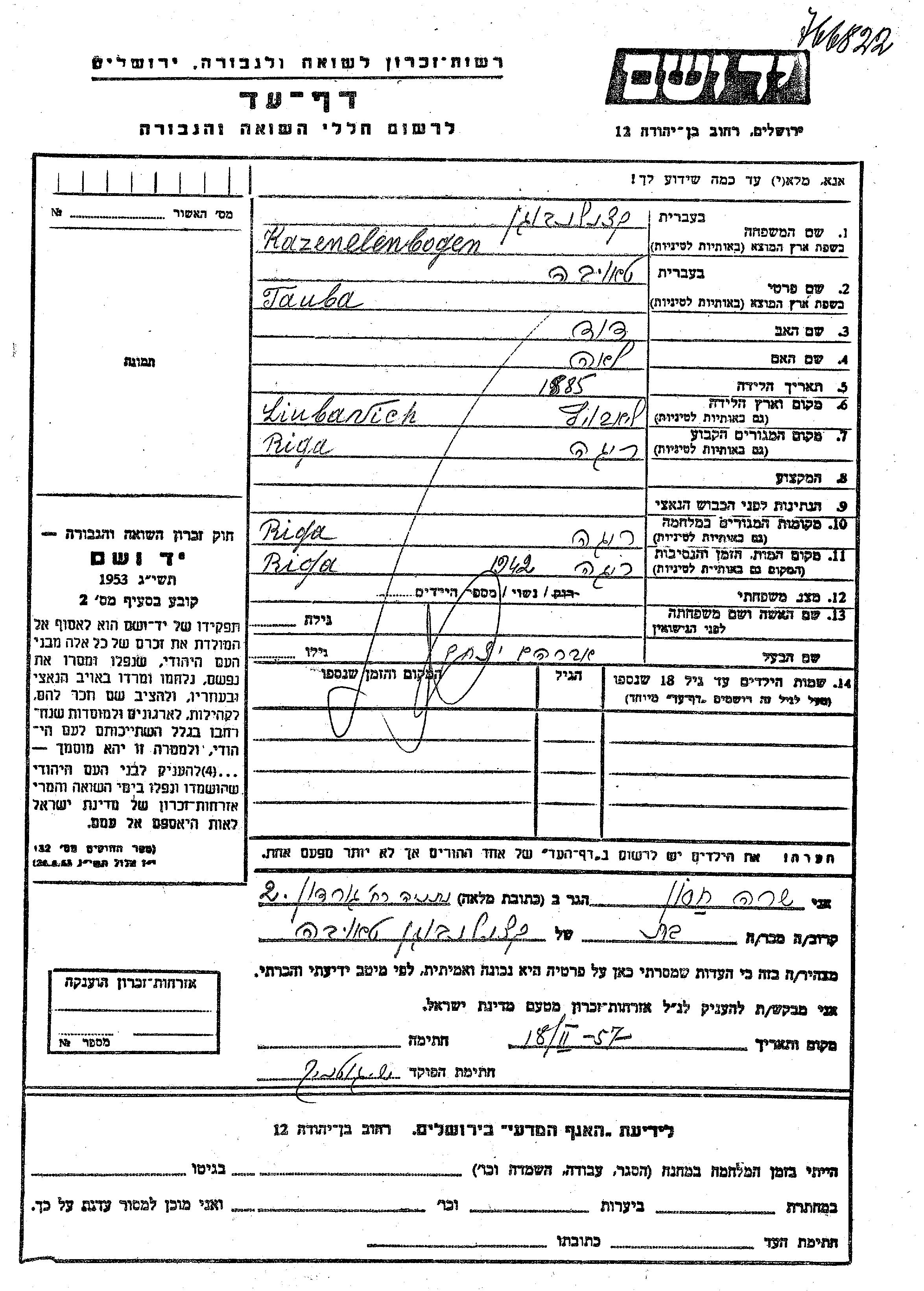 Kacenelenbogen | Tauba | 1890 | Riga, Lettonie | Feuille de témoignage |