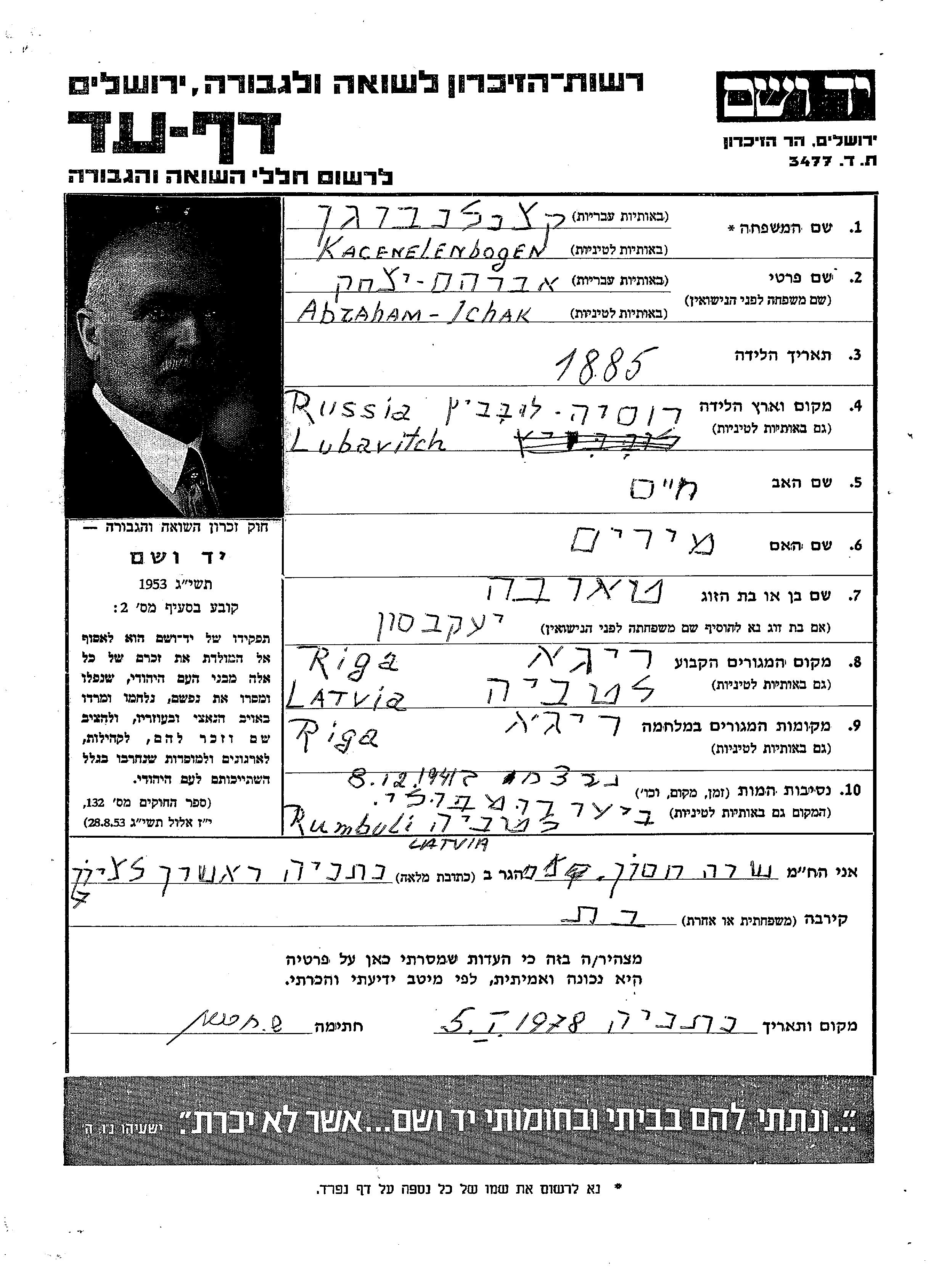 Avraham Yitzkhak Kacenelenbogen. Il était Commerçant/e. Avant la seconde guerre mondiale il vivait à Riga, Lettonie.