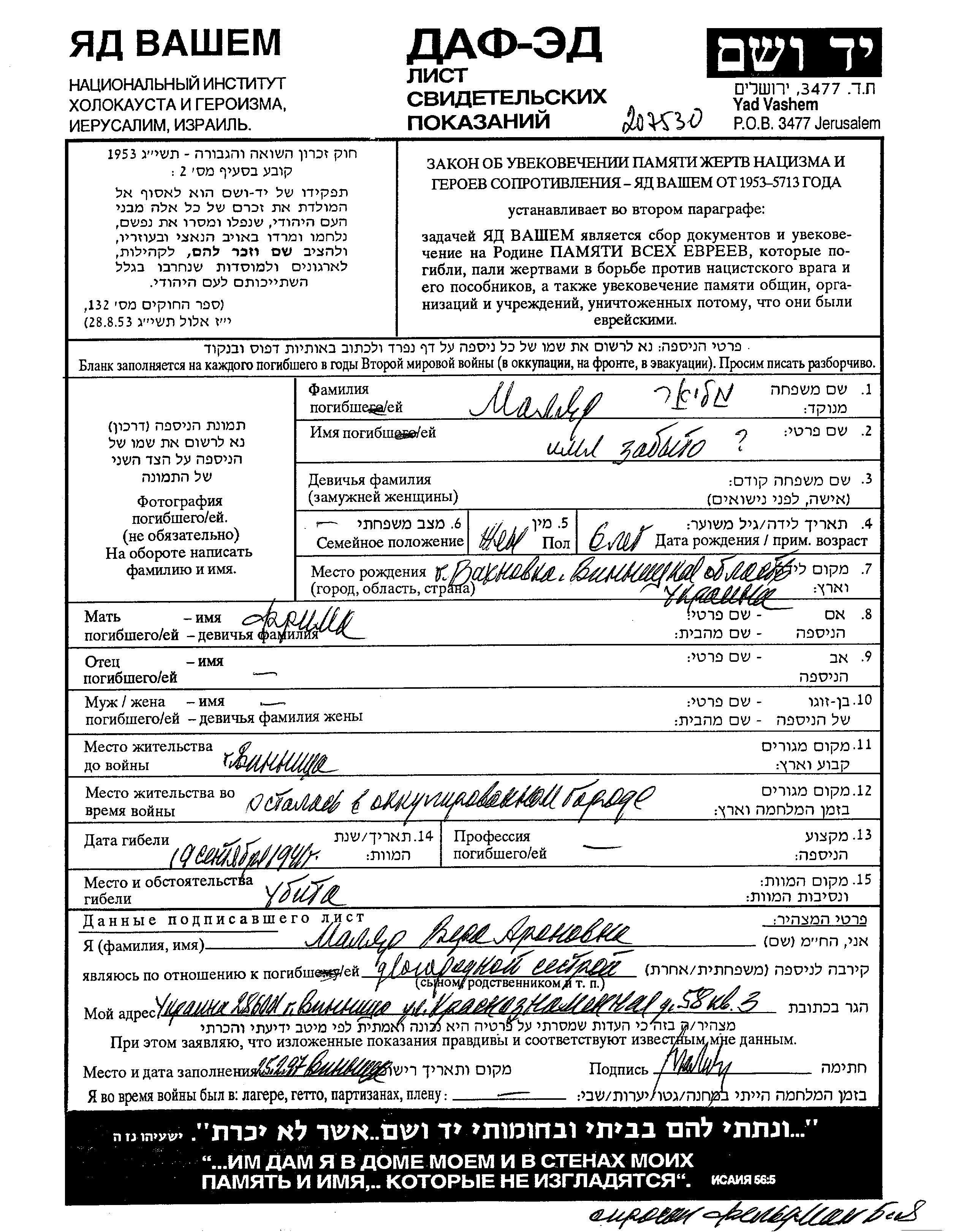 Malyar prénom inconnu 1935 Vinnitsa, Ukraine (URSS) Feuille de témoignage