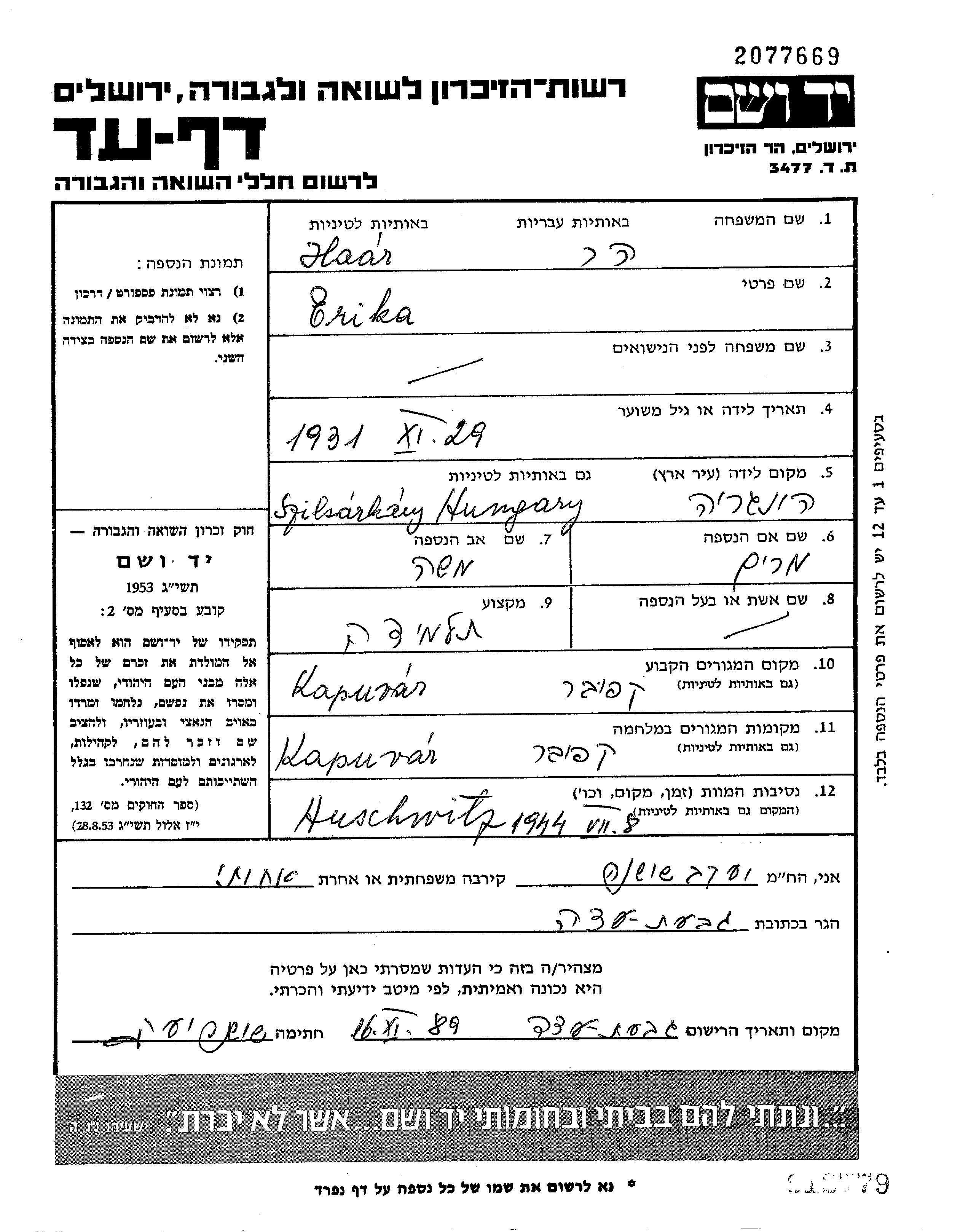 Erika Haar est née à Szilsarkany, Hongrie en 1931, fille de Moshe et de Miriam Maria née Rehberger. Elle était Élève et Enfant. Avant la seconde guerre mondiale elle vivait à Kapuvar, Hongrie. Pendant la guerre, elle était à Kapuvar, Hongrie.