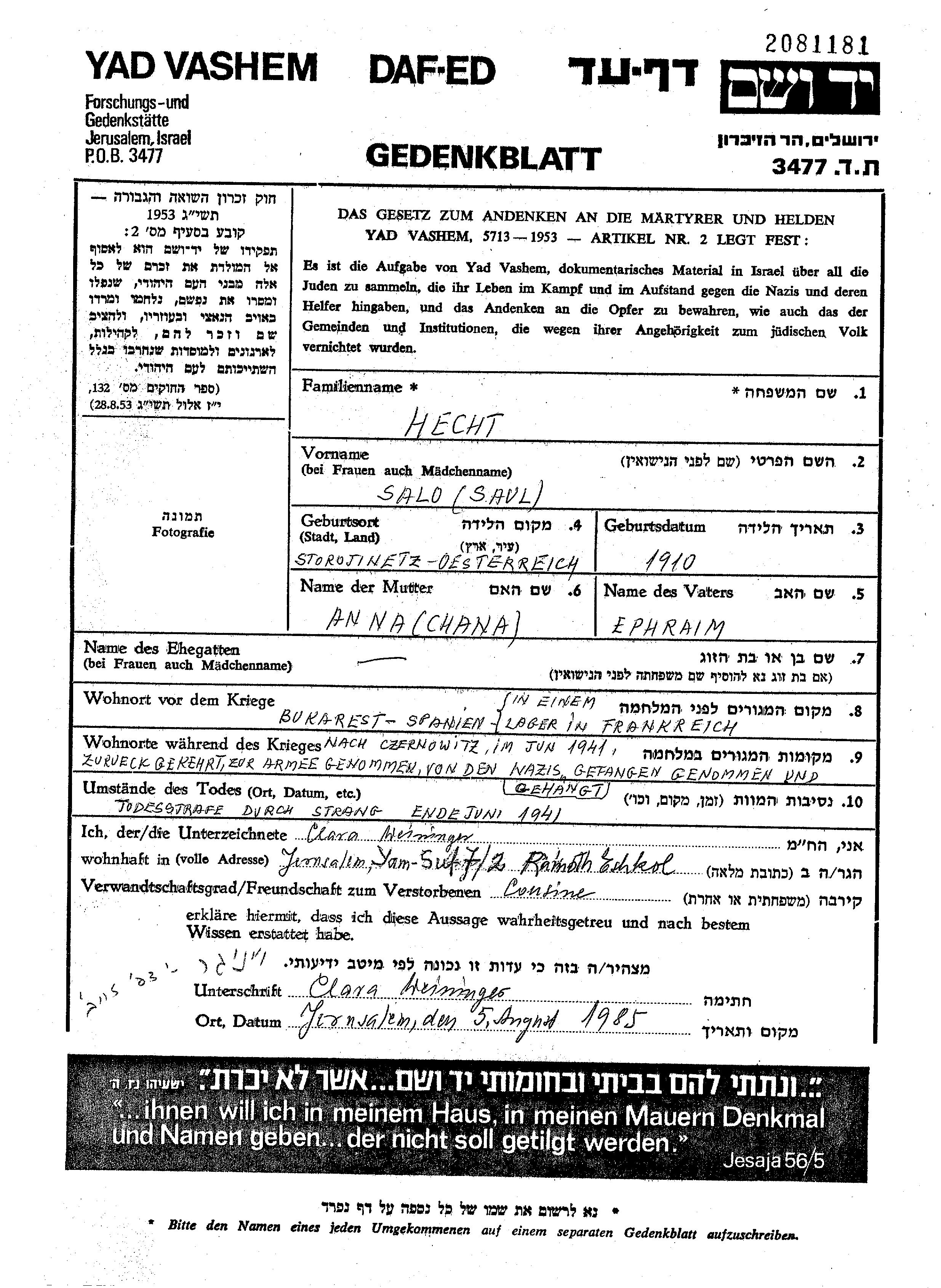 Salo Saul Hecht est né à Storojinet, Roumanie en 1910, fils de Ephraim et de Chana Anna. Il était Célibataire. Avant la seconde guerre mondiale il vivait à Bucuresti, Roumanie.